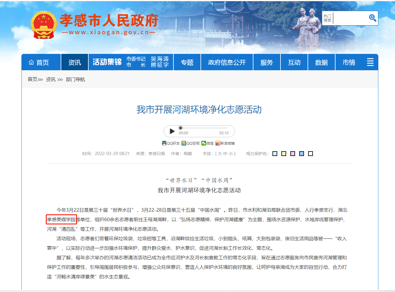 3月28日下午,为进一步提升爱水、护水意识,加强河湖环境保护,彰显水利人用实际行动参与河湖生态保护的良好精神风貌,带动社会力量关爱河湖、保护河湖。强化大学生思想道德素质,弘扬志愿服务精神。团市委、水利局向我校征集21名志愿者参加以“珍惜水资源,保护河湖生态环境”为主题的河湖保护宣传活动。