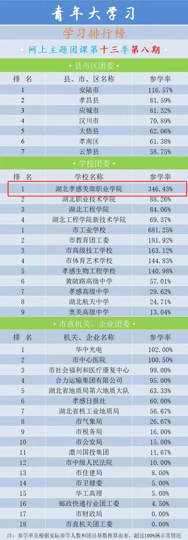 4月19日,青春孝感公布了关于“青年大学习”网上主题团课第十三季第八期的学习情况排名,我校在孝感市学校团委学习参学率中排名第一,并作为“优秀单位”交流学习经验。