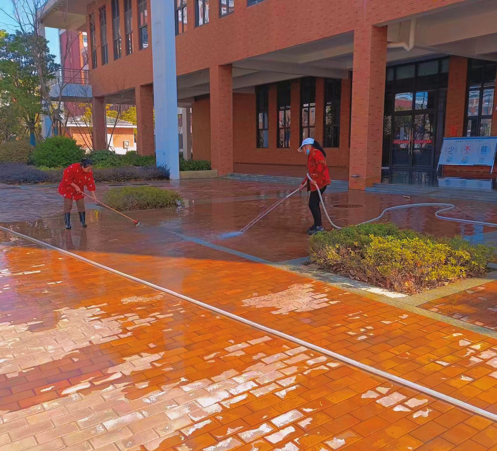 保洁人员对校园内各个区域进行了全面的卫生清洁。对学校教学楼、宿舍、楼道、厕所等公共重点区域进行了全面细致的消杀。