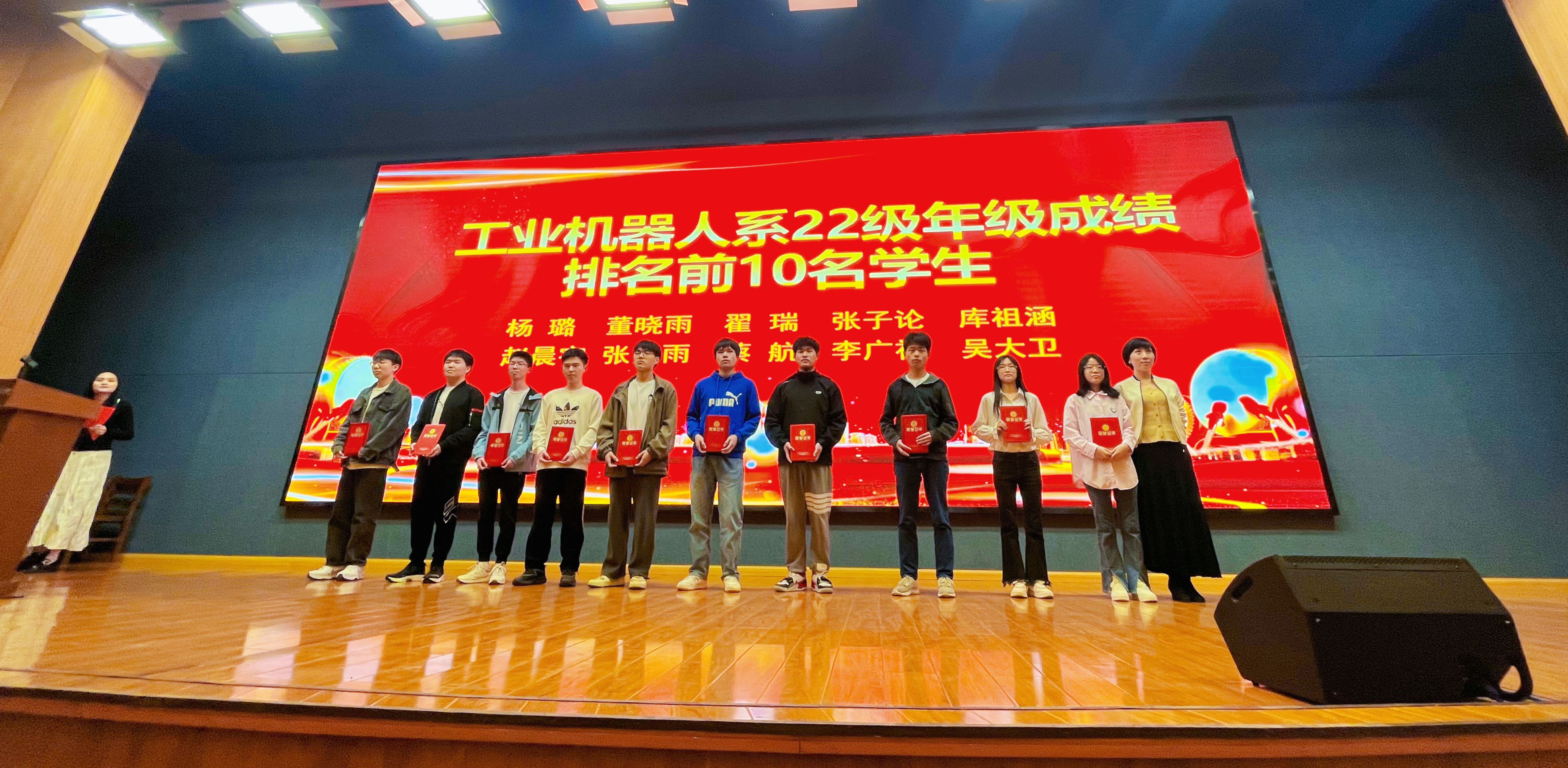 徐功瑾、刘园园、汪庆分别对21级年级前十名、22级年级前十和22级班级前十学生代表颁发荣誉证书并合影留念。