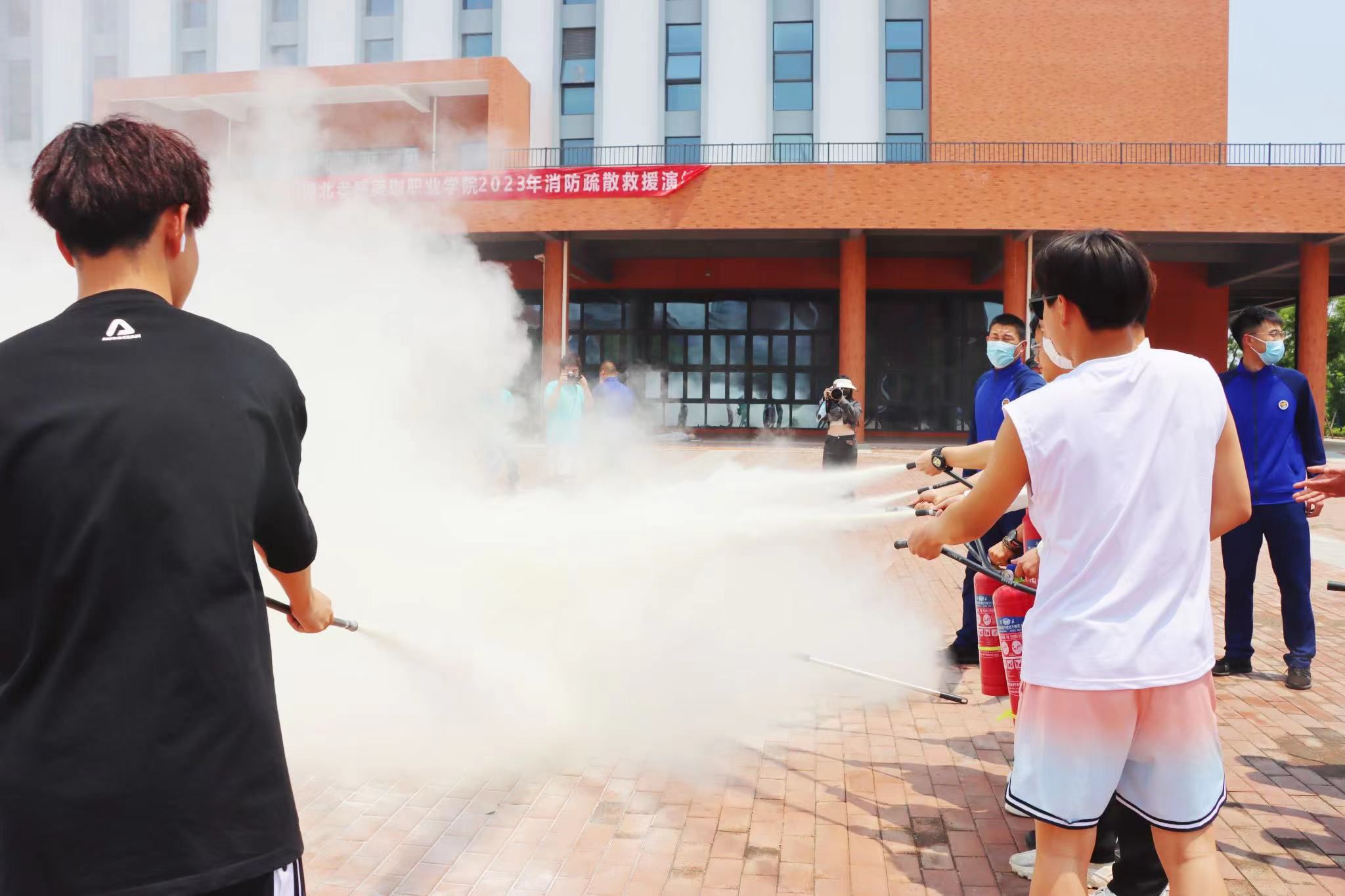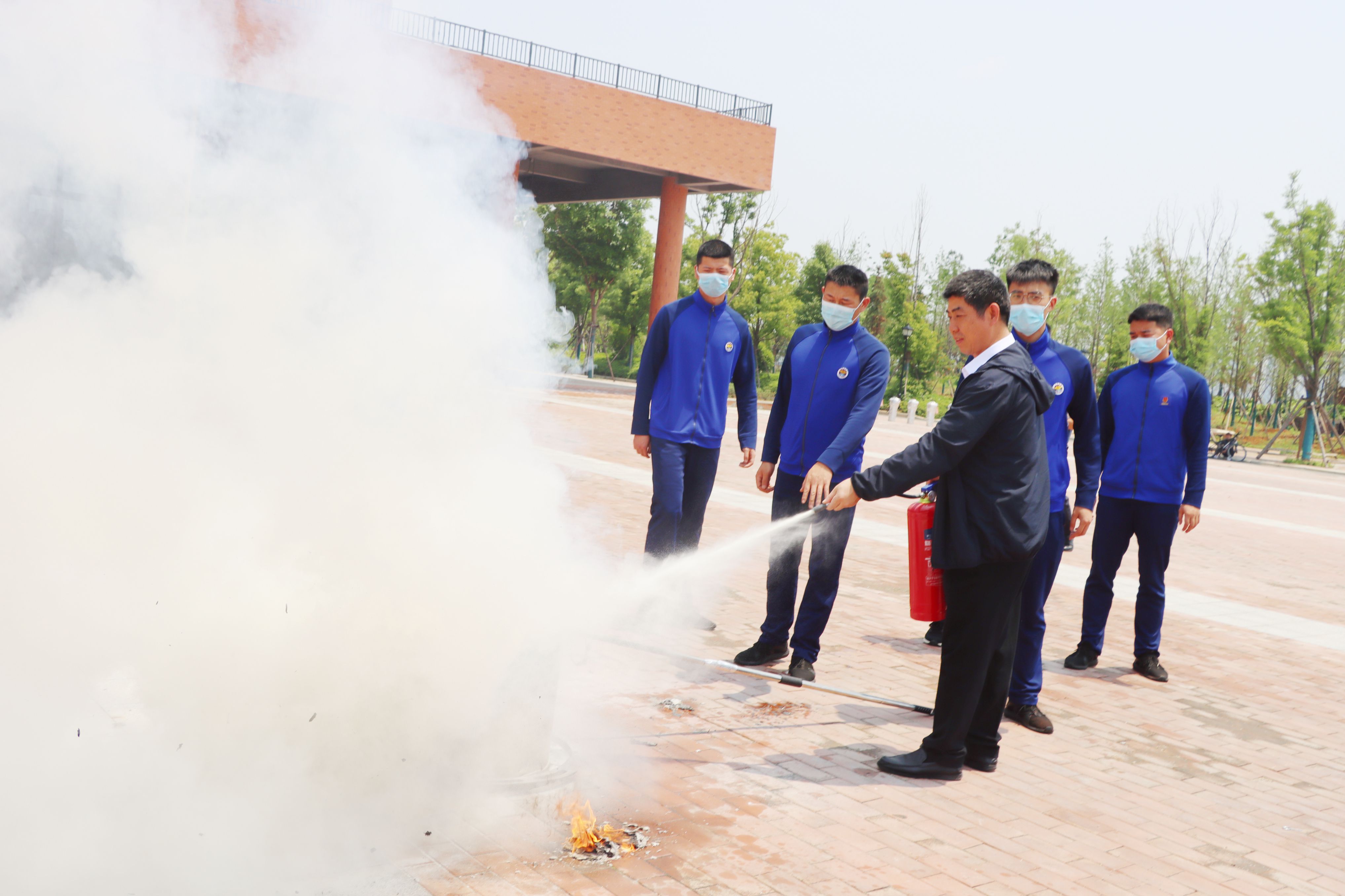 在疏散集结点,校长徐功瑾亲临演练现场指导,并亲自示范灭火器使用。
