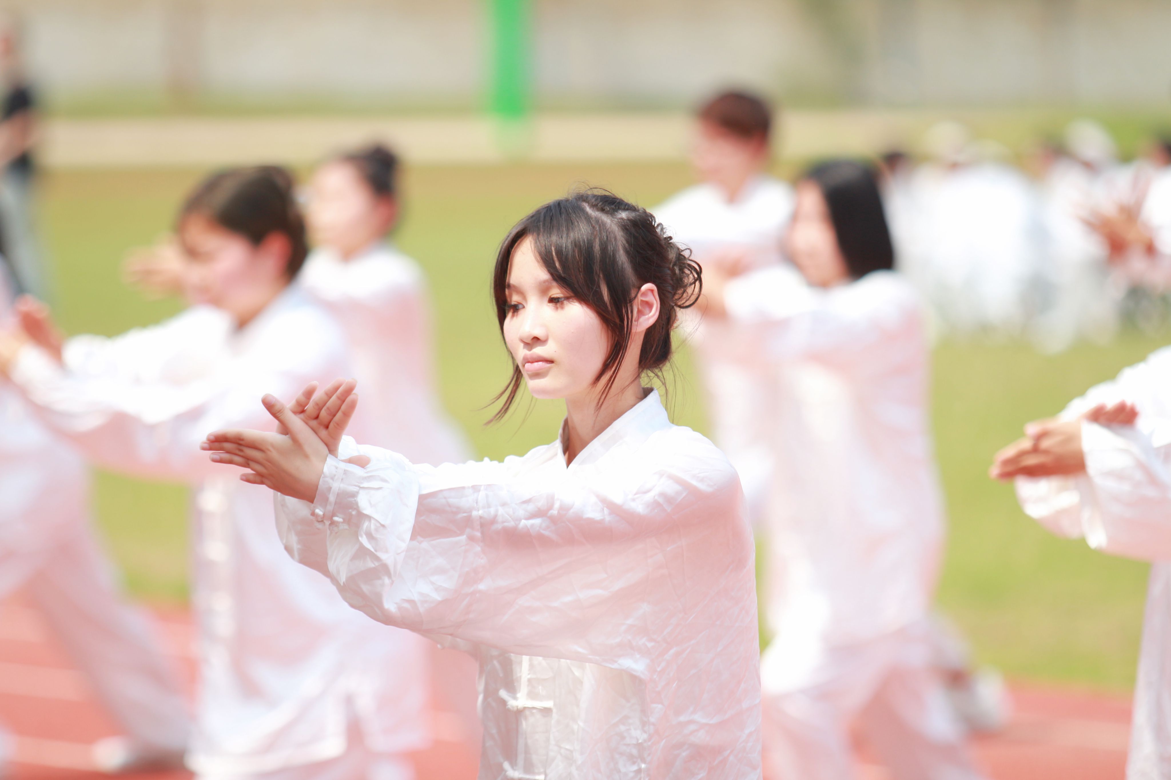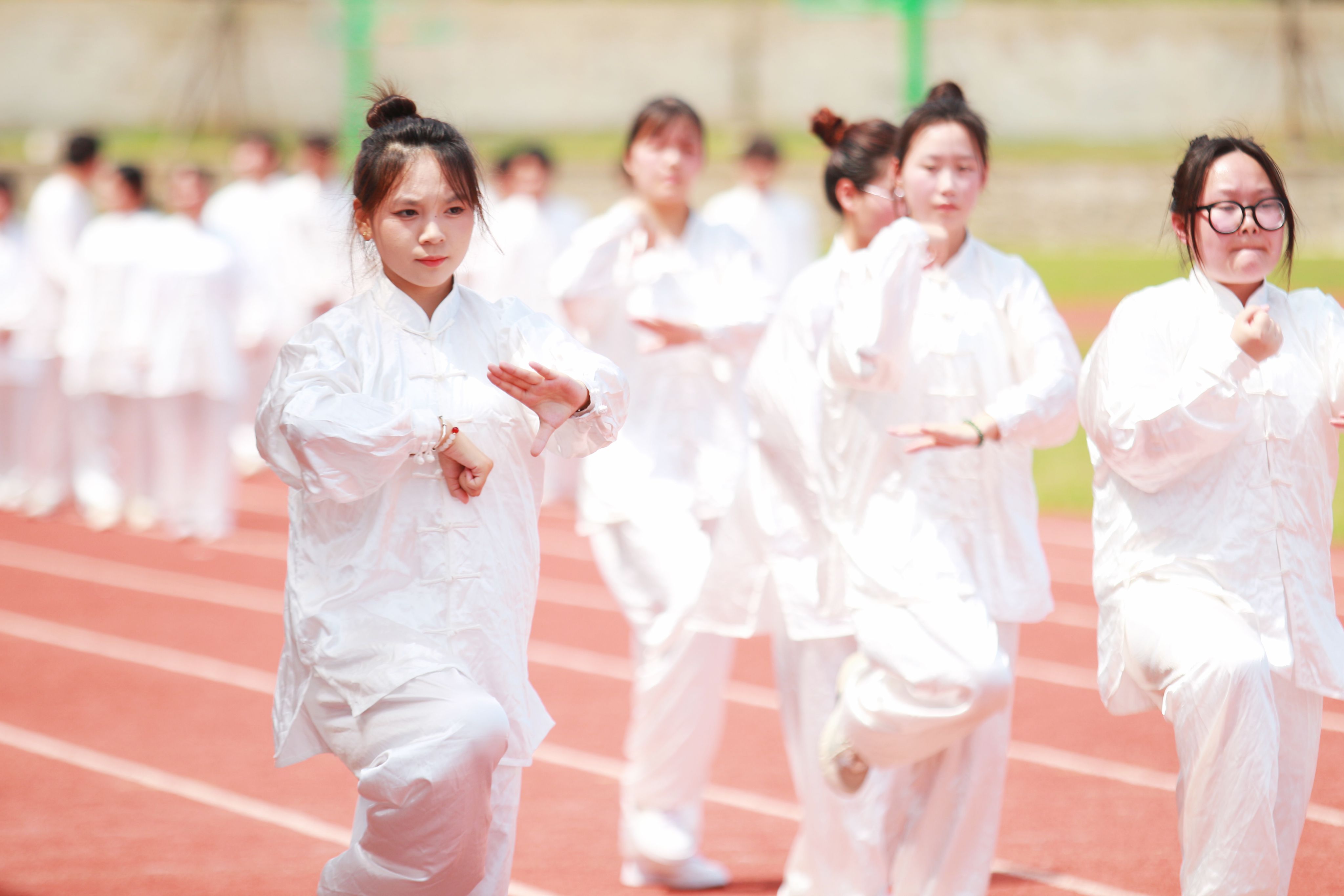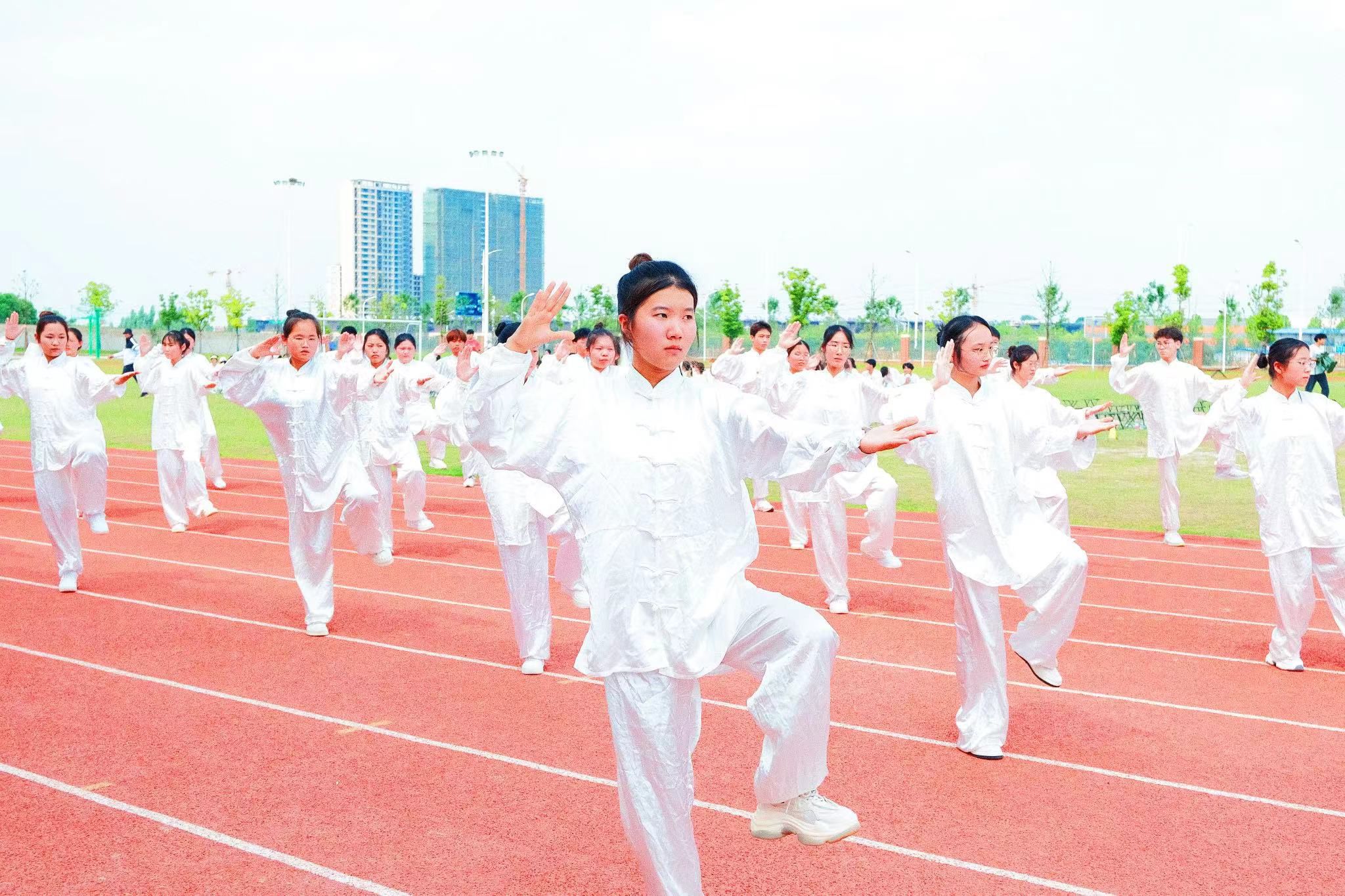 赛中,各展示班级伴随悠扬的音乐,动作流畅并柔和有度,白色的太极服在蓝天的辉映下,更是构成了赛场上一幅幅美丽的画卷。
