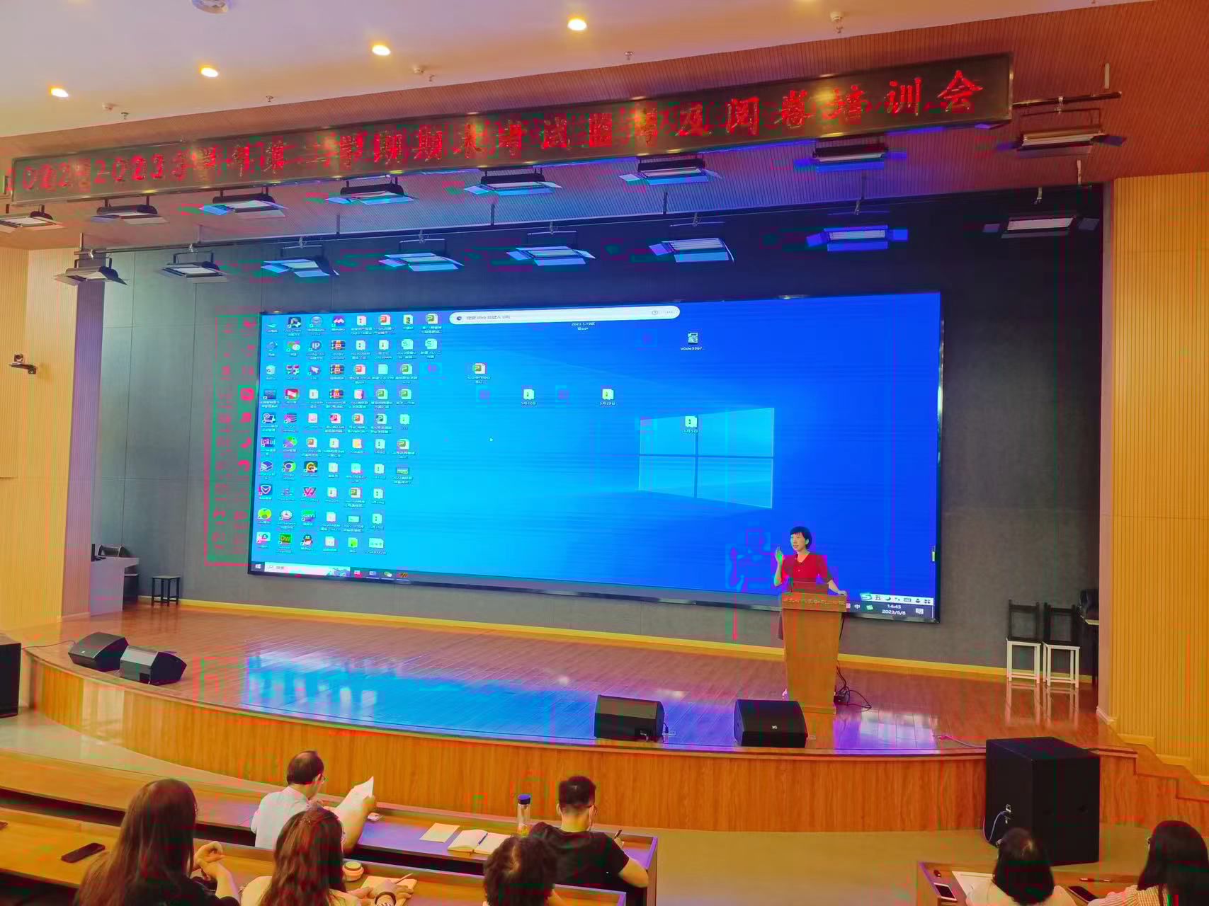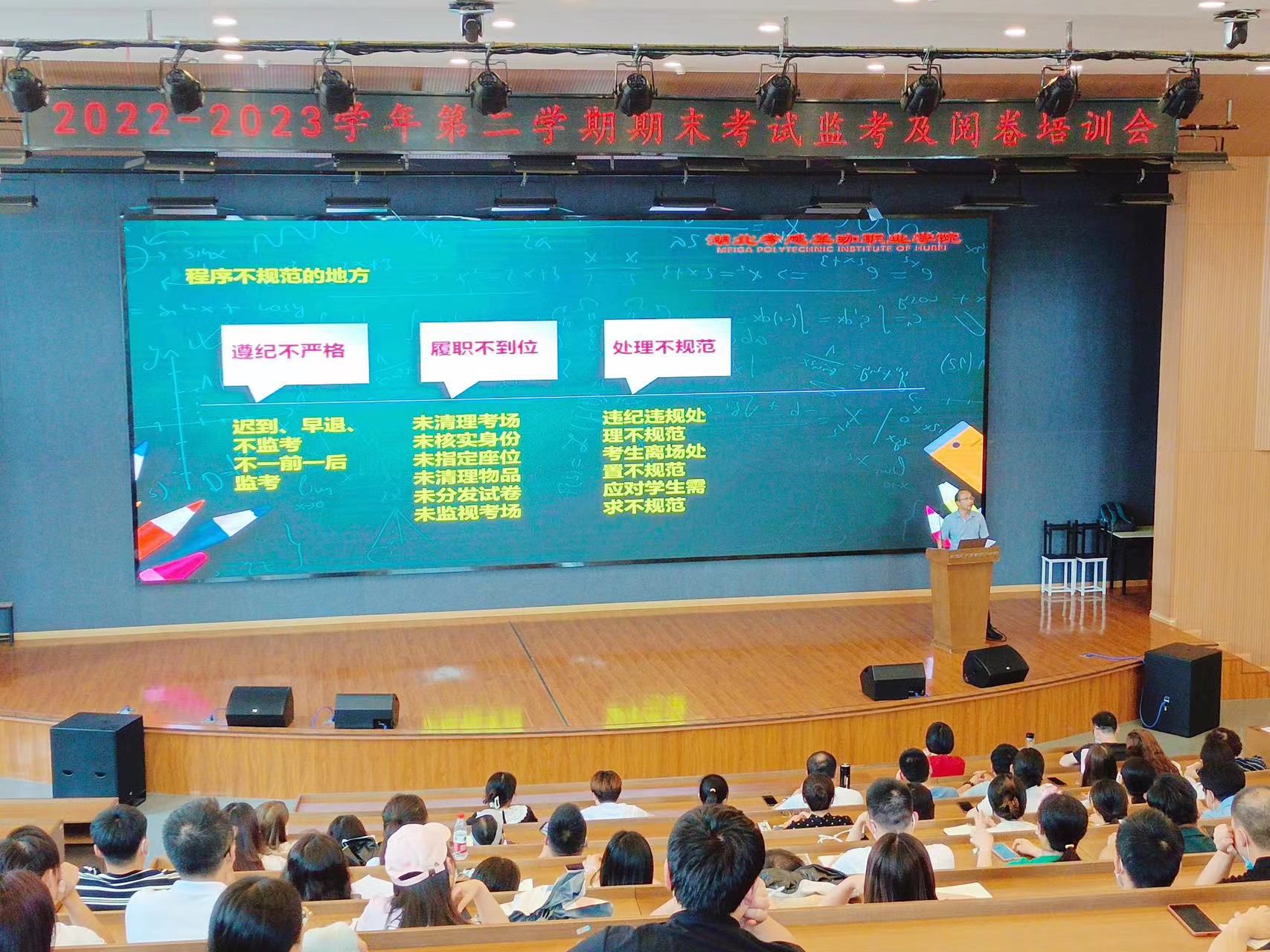 教务处副处长吴斌就期末考试期间的监考工作流程、监考教师工作职责以及规范试卷评阅工作等方面内容进行了专题培训。他提出,监考工作应程序规范,结果公正,监考老师应认真履行监考职责,严肃考风考纪,防范考生违反考试纪律的情况出现。