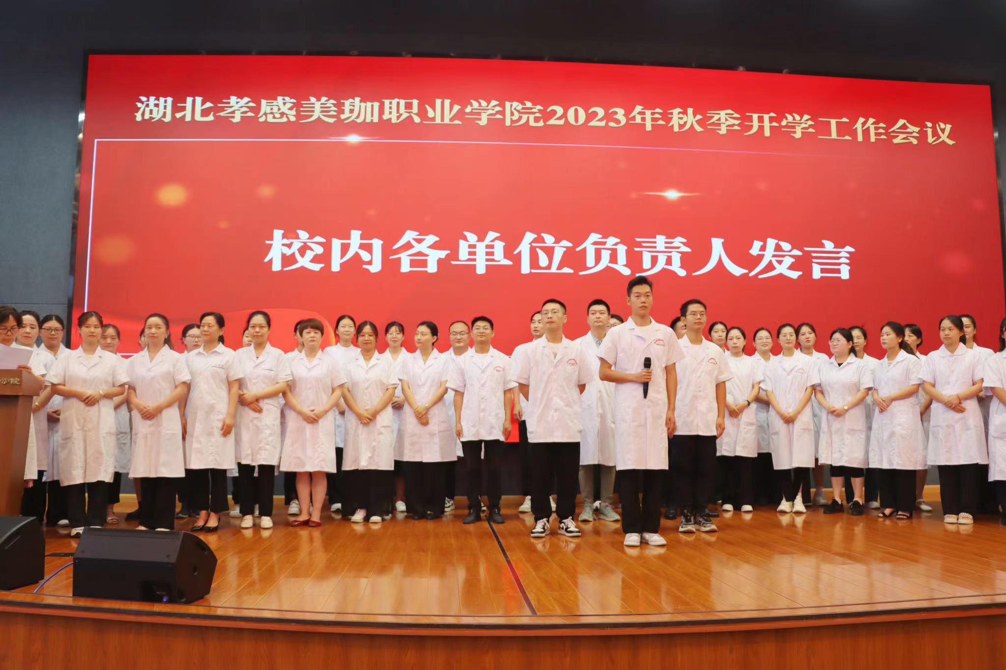 校长的讲话话声刚落,各院系、各部门的负责人带领自己着装整齐的团队,精神饱满、气宇轩昂,依次上台,一一发表岗位职责与使命宣言,立下新学期、新姿态,工作更上一层楼的豪迈誓言。