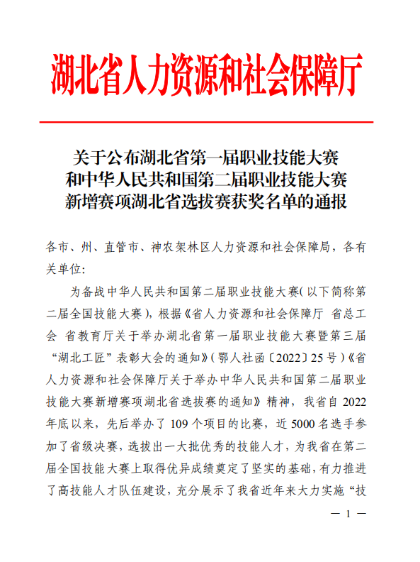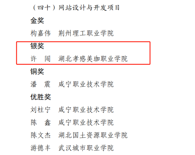 2024年1月17日,由湖北省人民政府主办,湖北省人力资源和社会保障厅、湖北省总工会、湖北省教育厅承办的湖北省第一届职业技能大赛网站设计与开发赛项获奖名单已公布。