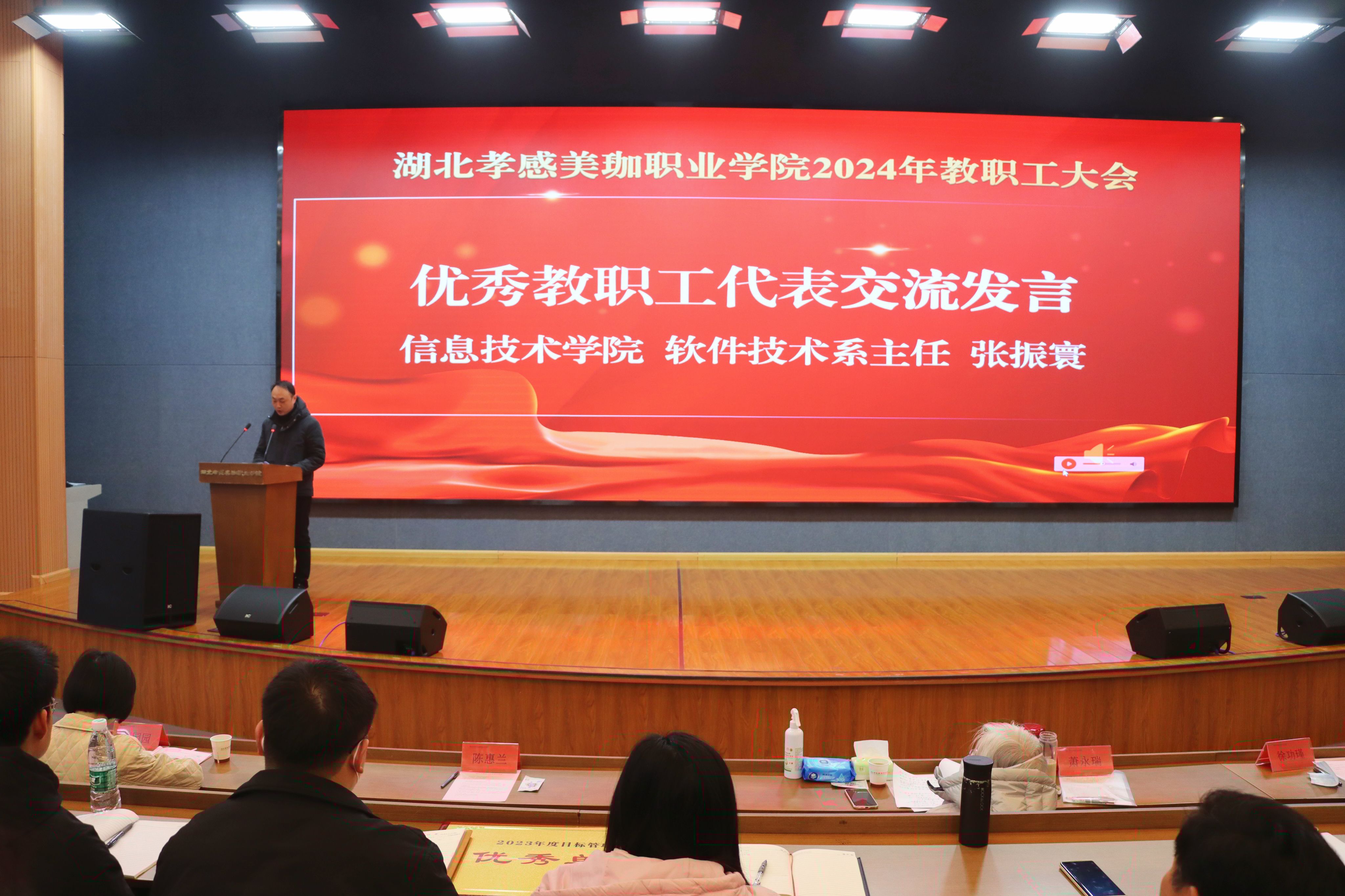 师德师风考核优秀教职工代表、信息技术学院软件技术系主任张振寰与大家共同分享他在工作期间的“三大心得”。第一,做一个积极追梦的人;第二,做一个热爱学习的人,教师比学生更需要学习;第三,做一个懂得感恩的人。