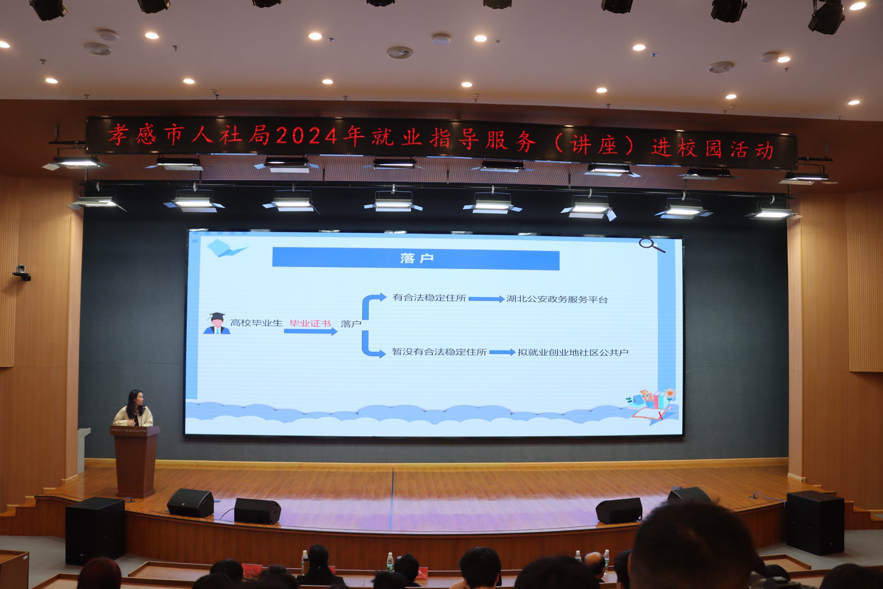 活动开始前,孝感市人才培养局李科长受邀在图书馆报告厅宣讲孝感市高校毕业生就业创业政策。从就业服务、企业吸纳、自主创业、职业培训、灵活就业、就业援助等方面进行了细致的讲解。资深职场导师伊叶老师受邀进行了专题讲座——《做好求职准备,开启全新征程》,从求职方法与渠道,及如何提升求职竞争力等方面为大家展开详细的讲解。