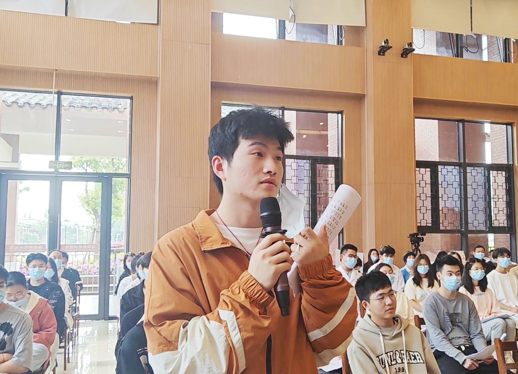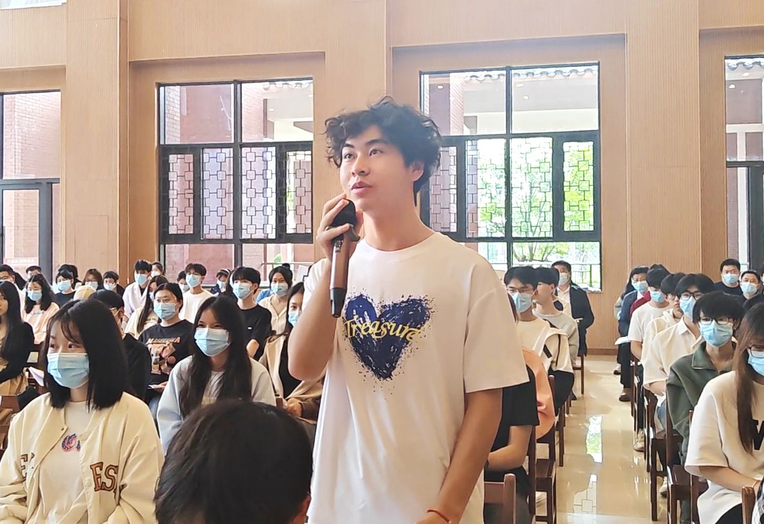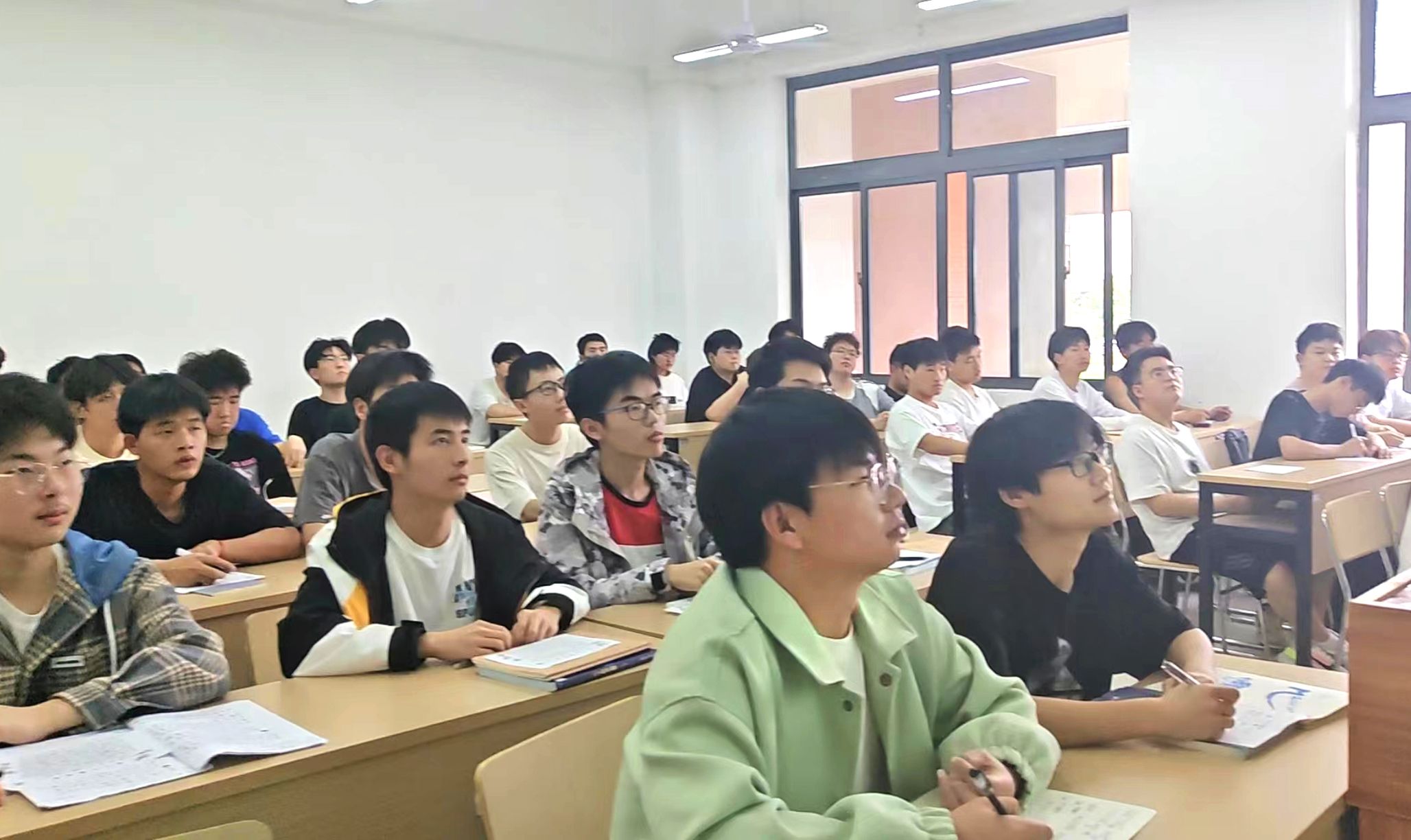 参加主会场现场聆听的有全体校领导、全体中层干部、各院系学生代表。其他学生在教学楼各自教室线上聆听了讲座。