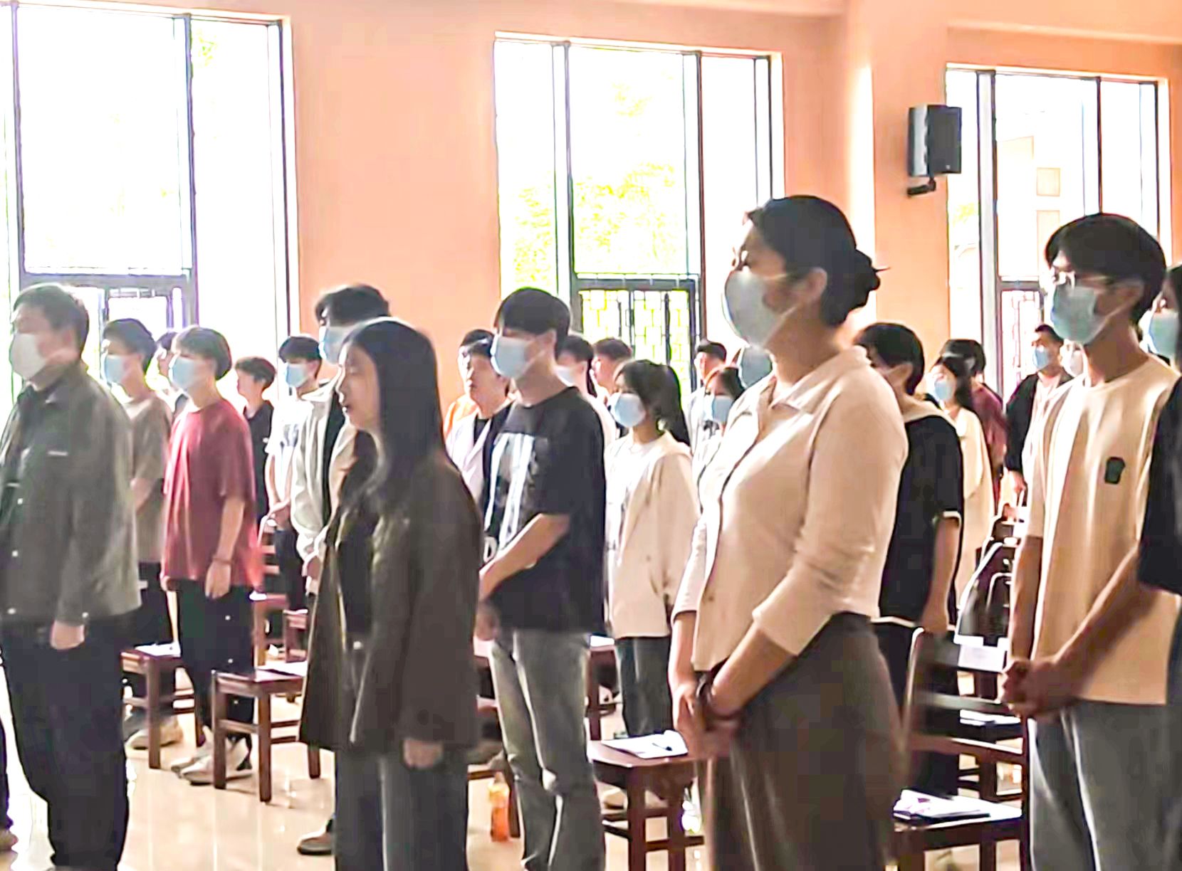 讲座结束后,萧永瑞女士要求在场听众全体起立,分隔一定距离站立,教会大家音声瑜伽基本功。