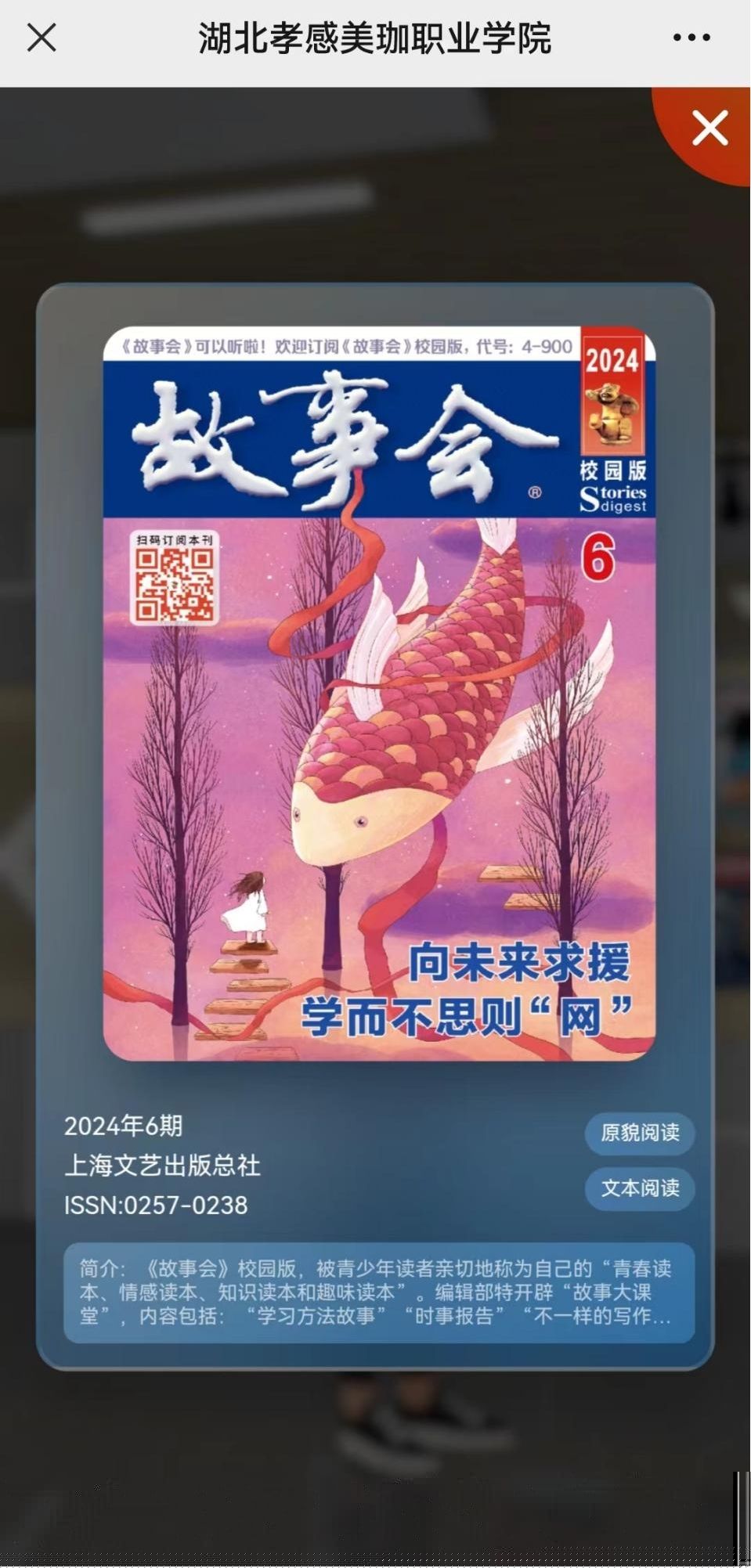 关注“美珈职院”微信公众号,点击菜单栏“美珈微+”—“图书馆-博看书苑”,点击“我的”登录注册,输入机构授权码“xgmjzy”方可注册成功。