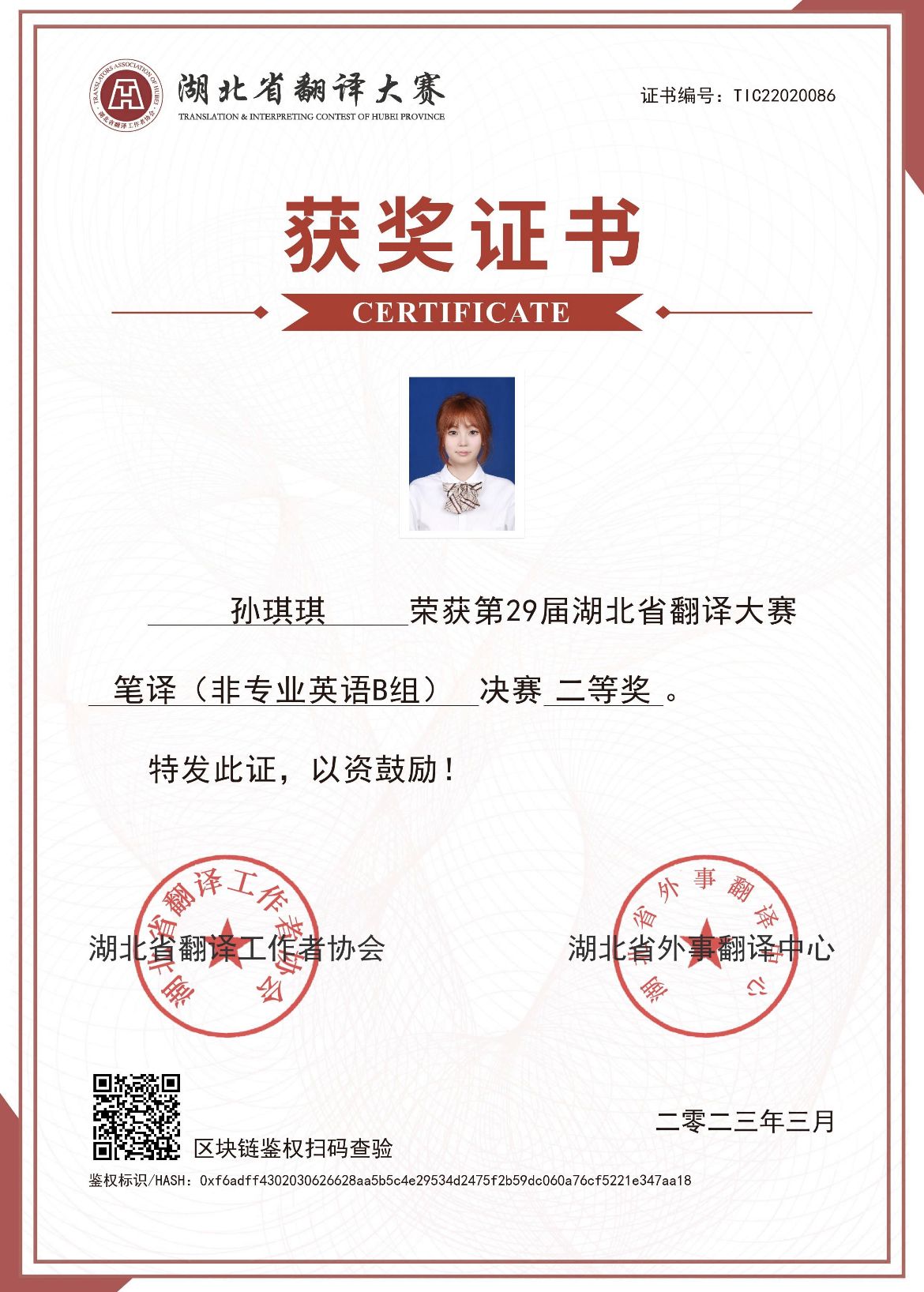 2023年3月,外国语学院22级商务英语专业学生在第29届湖北省翻译大赛笔译(非专业英语B组)决赛中荣获二等奖2个。
