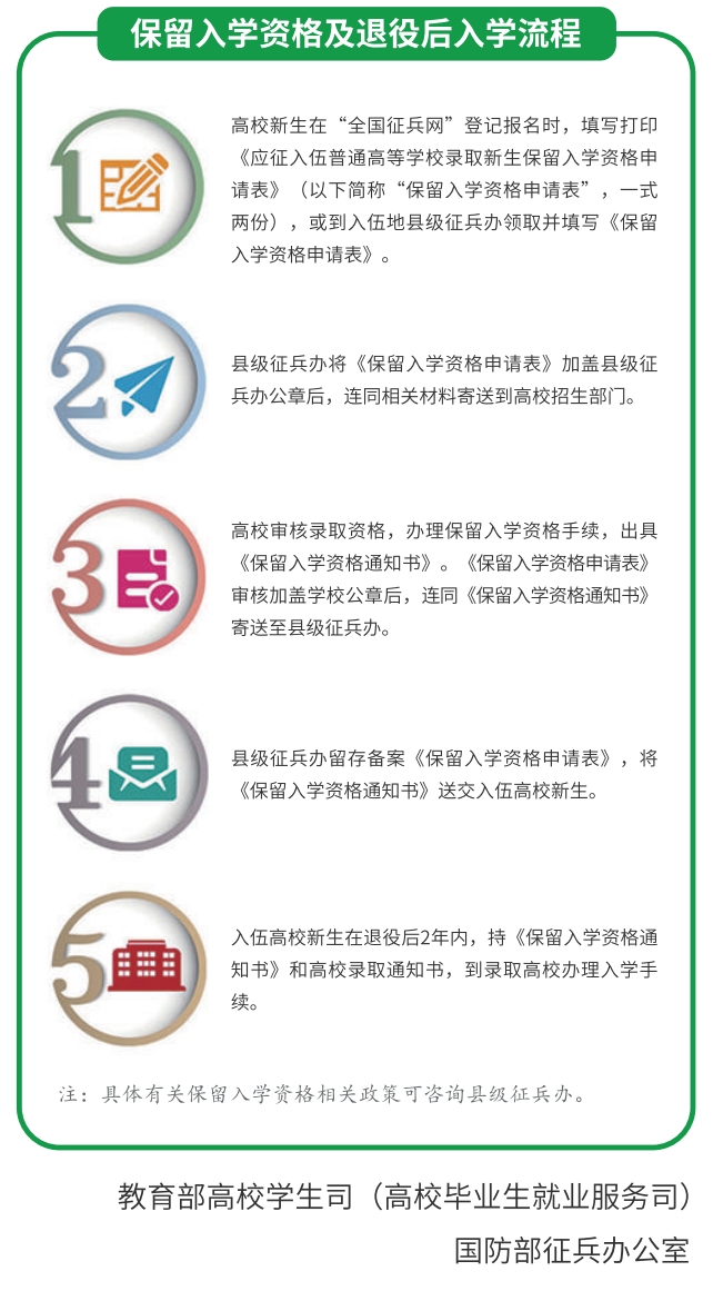 2.保留入学资格:高校新生入伍,高校为你保留入学资格,退伍后2年内可入学。