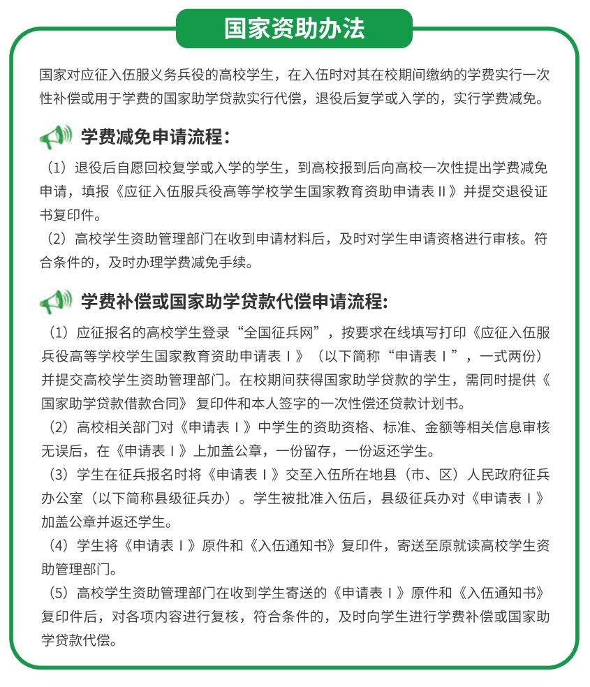 3.国家资助学费:国家对应征入伍服义务兵役高校学生,在入伍时对其在校期间缴纳的学费实行一次性补偿或用于学费的国家助学贷款实行代偿;对应征入伍服义务兵役前正在高等学校就读的学生(含按国家招生规定录取的高校新生),退役后自愿复学或入学的,实行学费减免。学费补偿、国家助学贷款代偿以及学费减免的标准,本专科生每生每年最高不超过16000元,研究生每生每年最高不超过20000元。