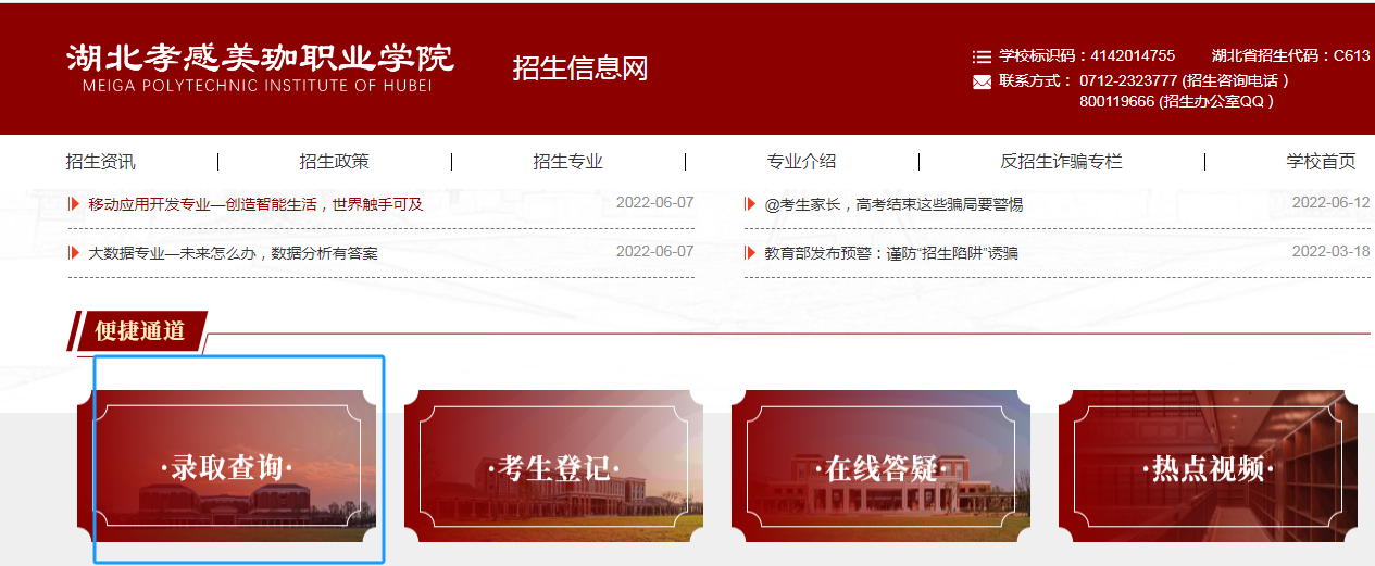点击【招生就业】,选择【招生信息网进入】,在招生信息网底端【录取查询】版块输入考生姓名和13位考生号即可查询录取专业和通知书物流单号。