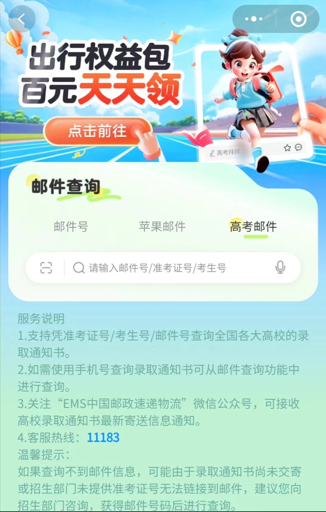 1、关注“EMS中国邮政速递物流”微信公众号,输入考生准考证号、考生号、邮件号任意一个,即可查询通知书物流状态;