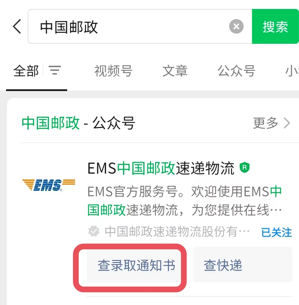 1. 关注“EMS中国邮政速递物流”微信公众号,输入考生准考证号、考生号、邮件号任意一个,即可查询通知书物流状态;