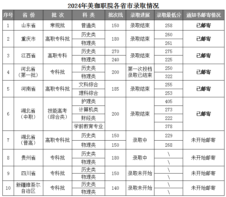 截至今日,我校已完成了山东省、重庆市、江西省、河北省(第一批)、河南省、湖北省(中职)相应批次录取和通知书邮寄工作;剩余几个省份的录取正在陆续进行中。