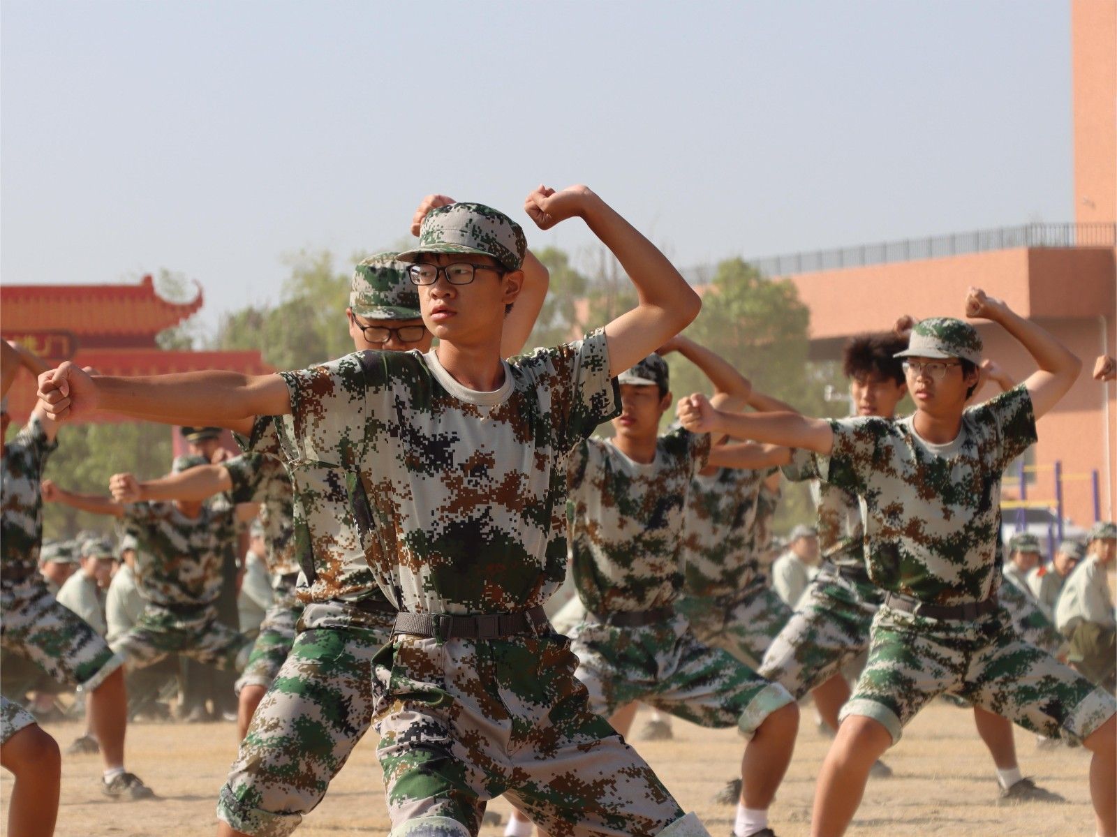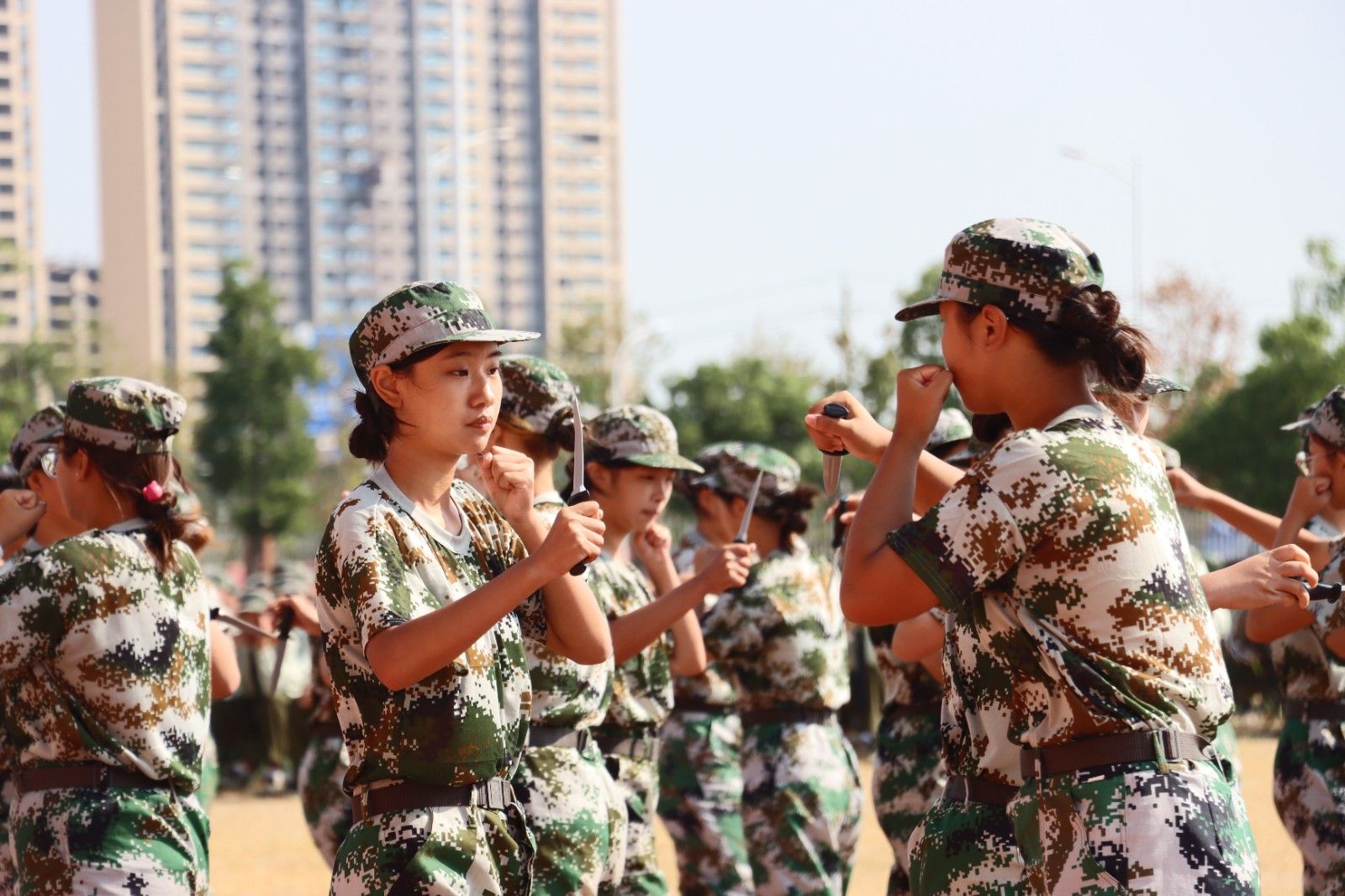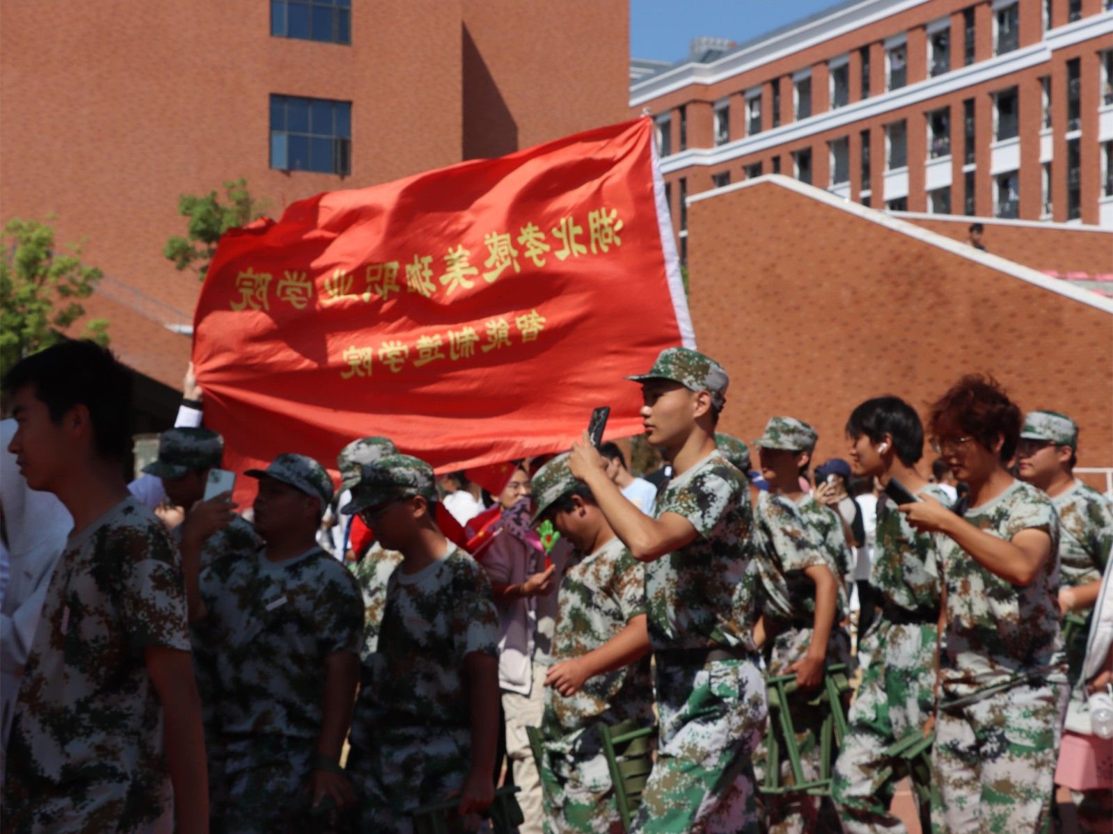 美珈职院操场上红旗迎风飘扬,操场上的红色跑道、新生佩戴的红色领带……到处都充满了属于年轻人的生机与活力。“服从命令、听从指挥、团结互助、争创佳绩”、“军纪如铁,意志如钢,勇担重任,力创一流”主席台两侧的条幅上写着对全体学生的要求。