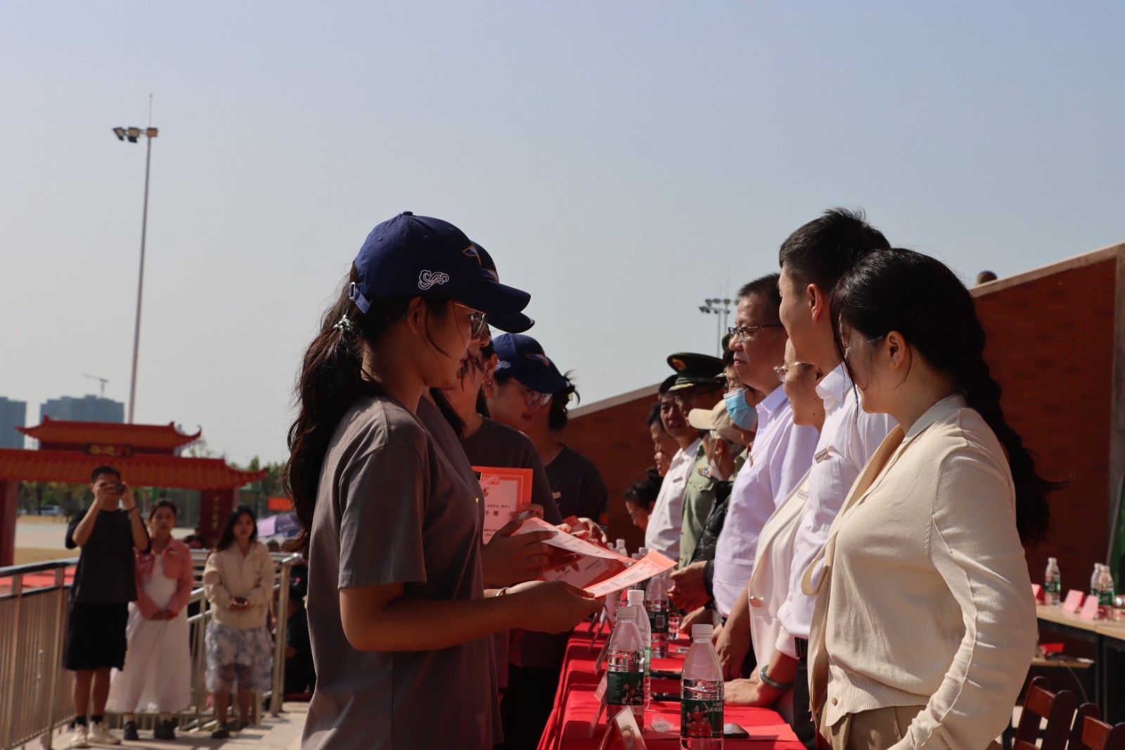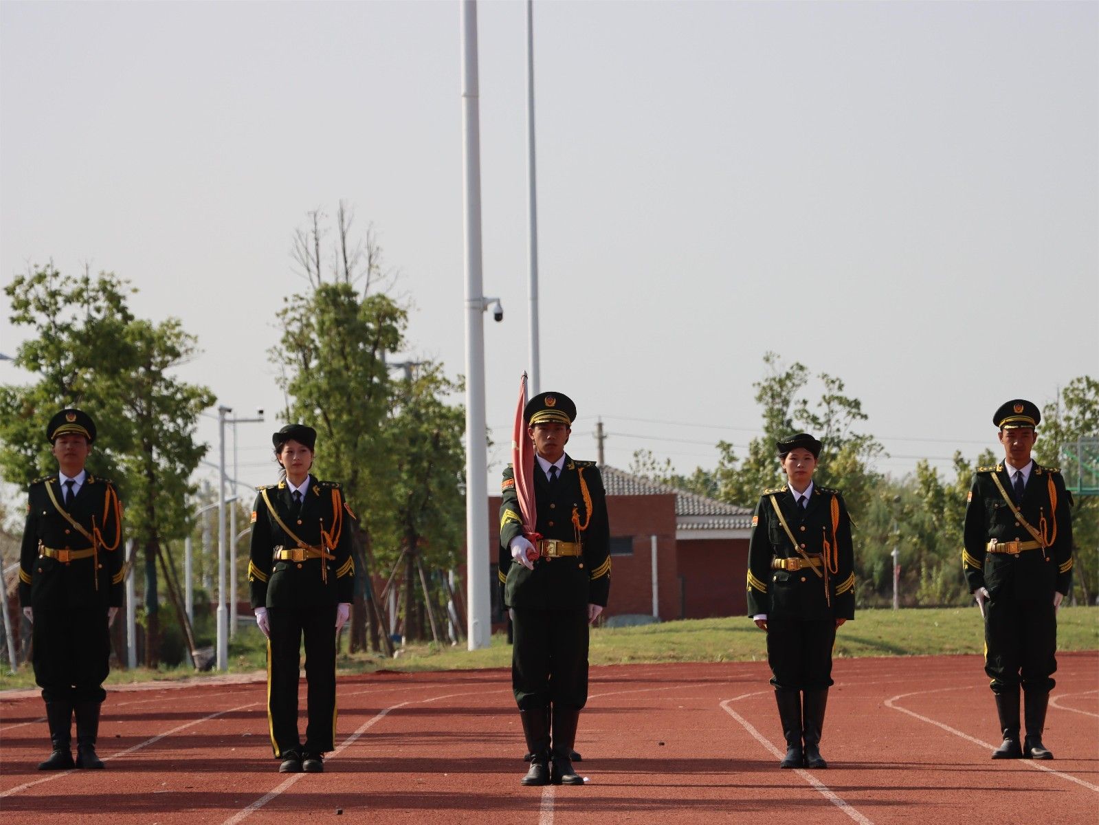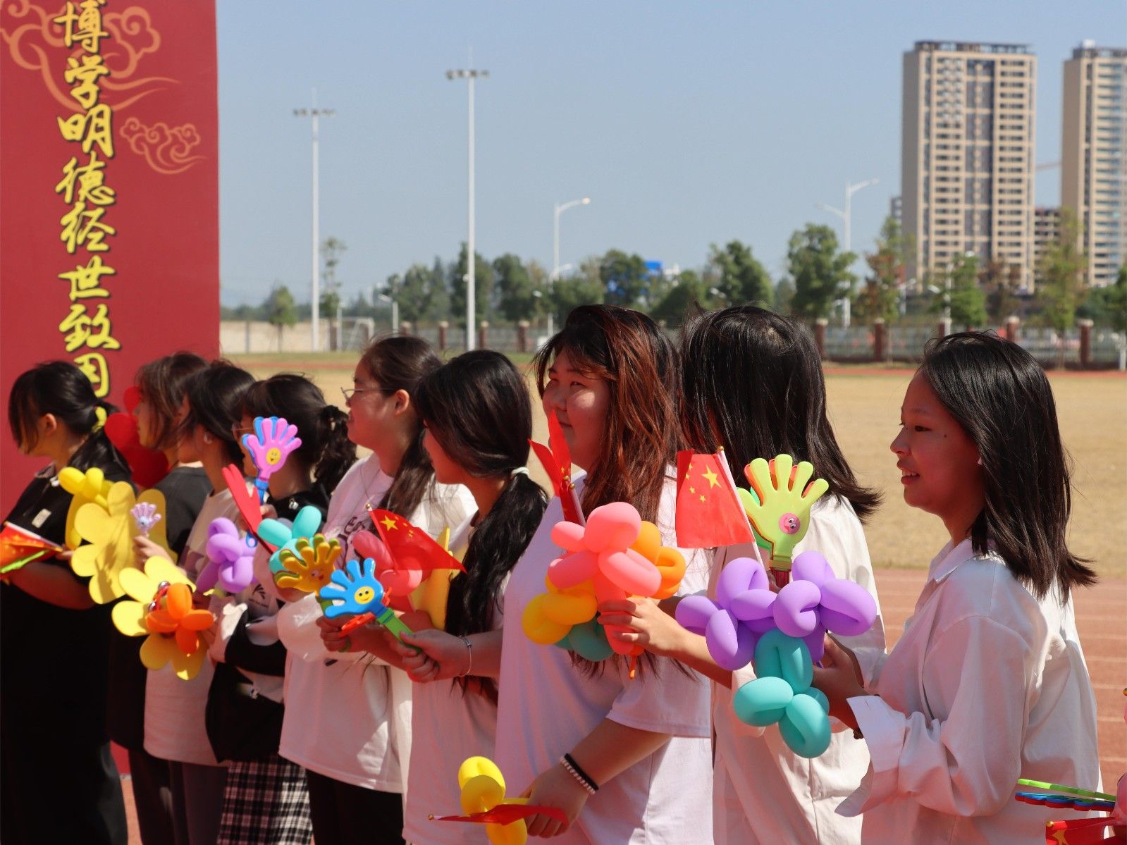 美珈职院操场上红旗迎风飘扬,操场上的红色跑道、新生佩戴的红色领带……到处都充满了属于年轻人的生机与活力。“服从命令、听从指挥、团结互助、争创佳绩”、“军纪如铁,意志如钢,勇担重任,力创一流”主席台两侧的条幅上写着对全体学生的要求。