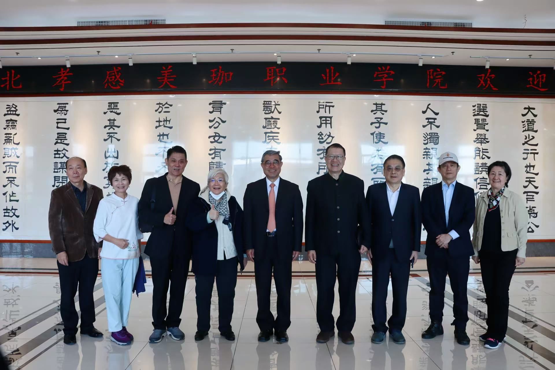 图片说明:美珈职院名誉校长萧永瑞(左四)、台湾新党主席吴成典(左五)与来宾拍照留念。