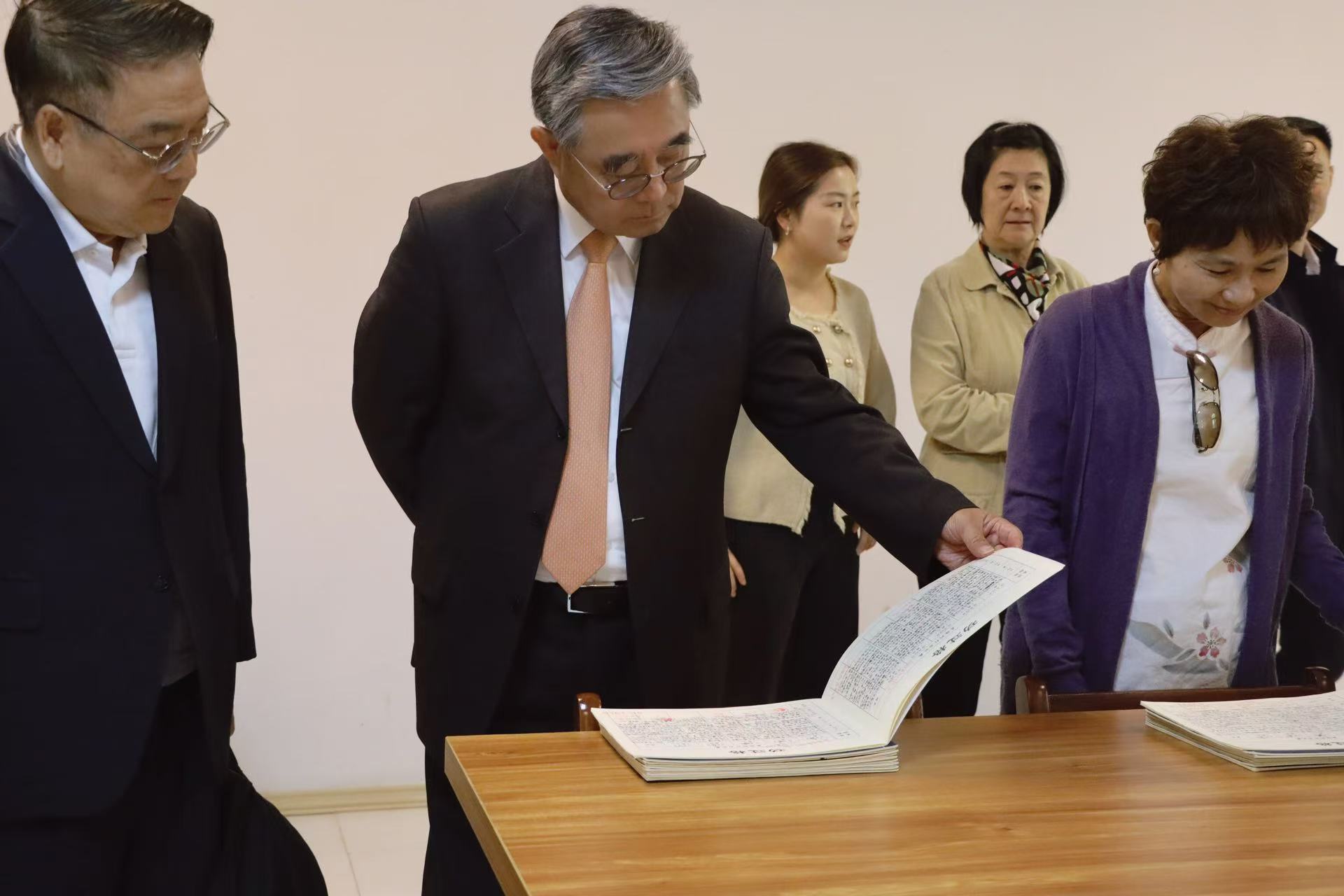 图片说明:吴成典(中间)浏览学生写的《功过格》。