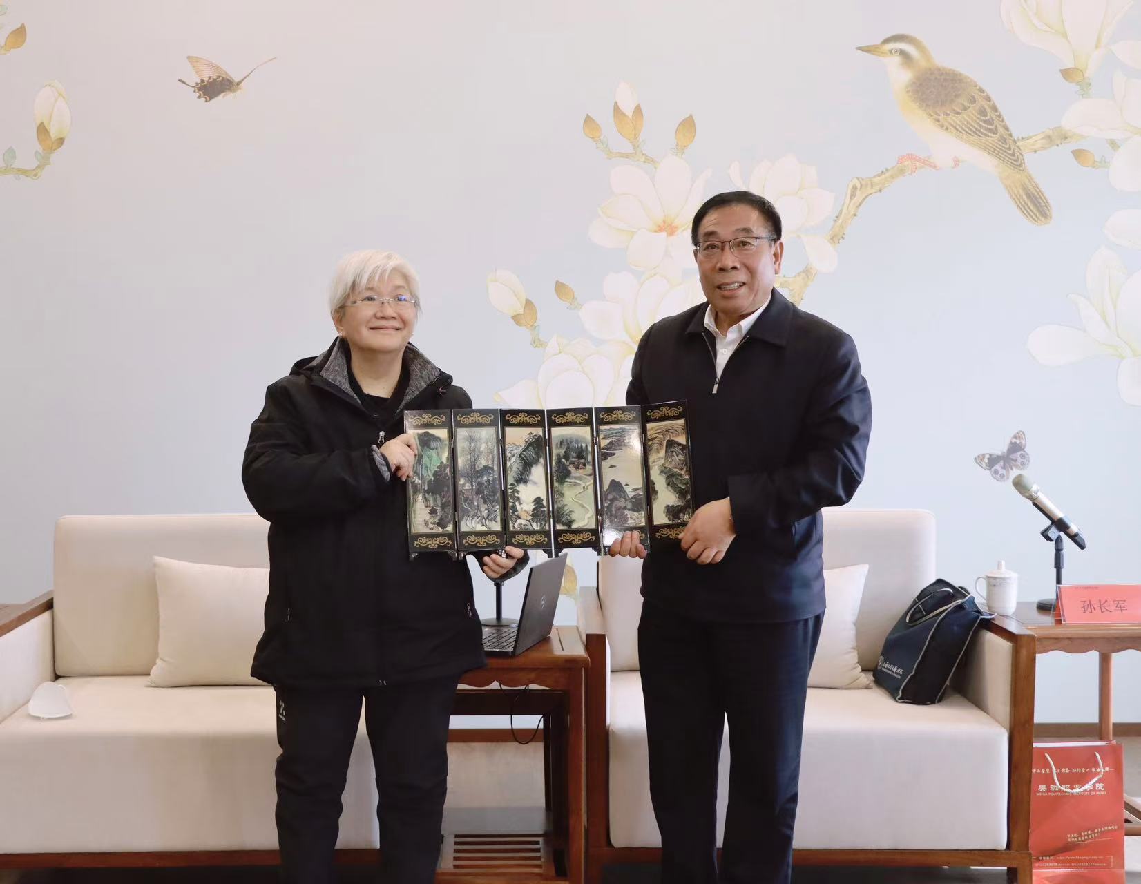 座谈会最后,孙长军先生向萧董事长赠送山西非物质文化遗产——平遥漆器摆件,并祝愿美珈职院越办越好。