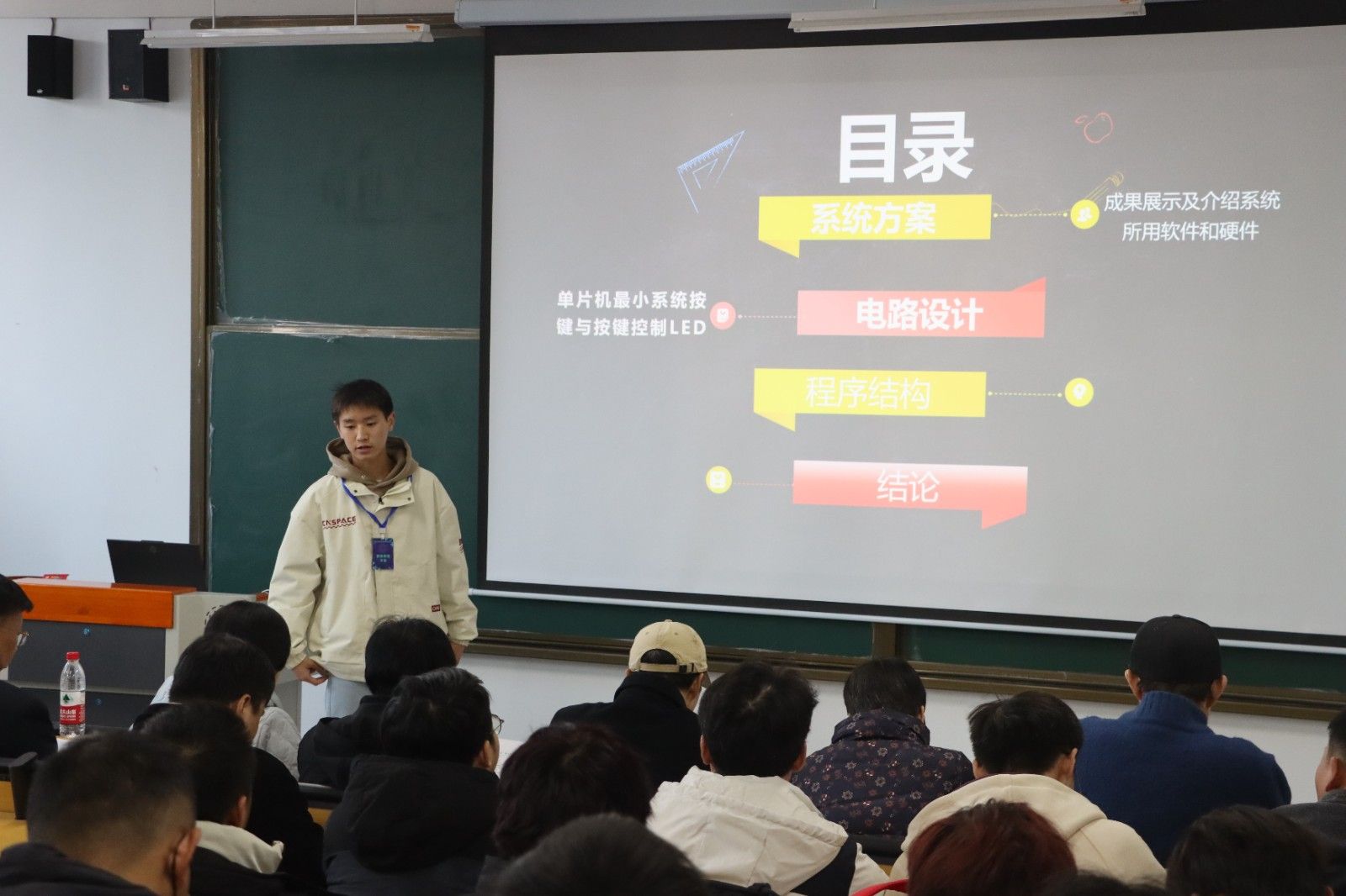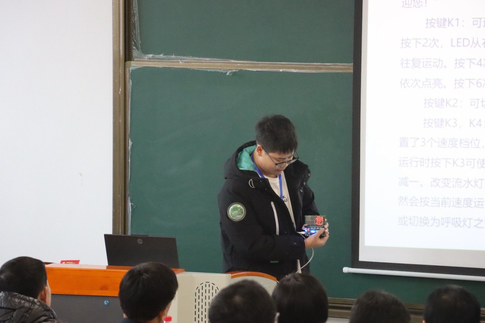 参加此次竞赛的十二位选手均来自智能制造学院创新中心的不同年级和不同专业的学生,他们经过了为期一个月的学习和训练,从零基础到能自己设计并实现流水灯等效果,展现了惊人的进步和才华。比赛过程中,选手们结合PPT的介绍,详细阐述了他们基于51单片机的多功能显示与交互设计项目、LED点阵滚动显示“美珈职院欢迎您”、流水灯及呼吸灯效果的设计思路、制作过程以及作品的功能特点。同时,他们还通过现场演示作品的效果,让评委们更加直观地了解他们的设计成果。他们的现场表现精彩纷呈,充分展现了当代大学生的创新思维和实践能力。