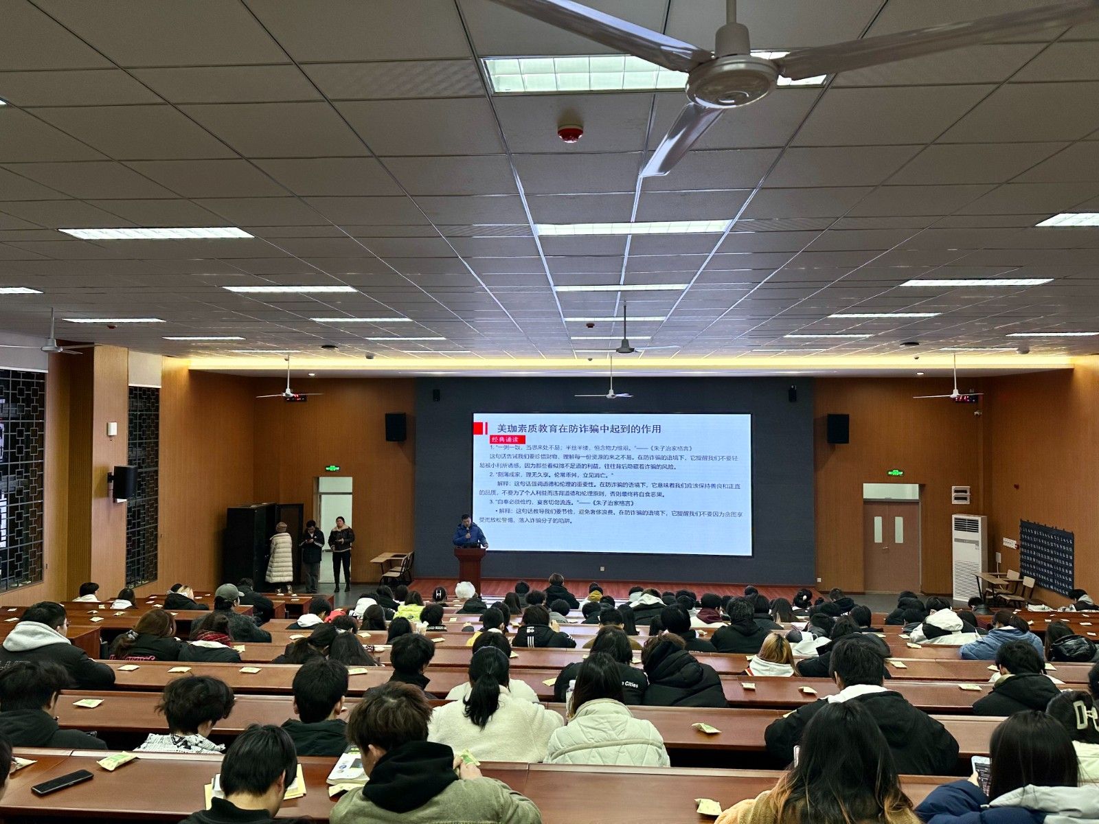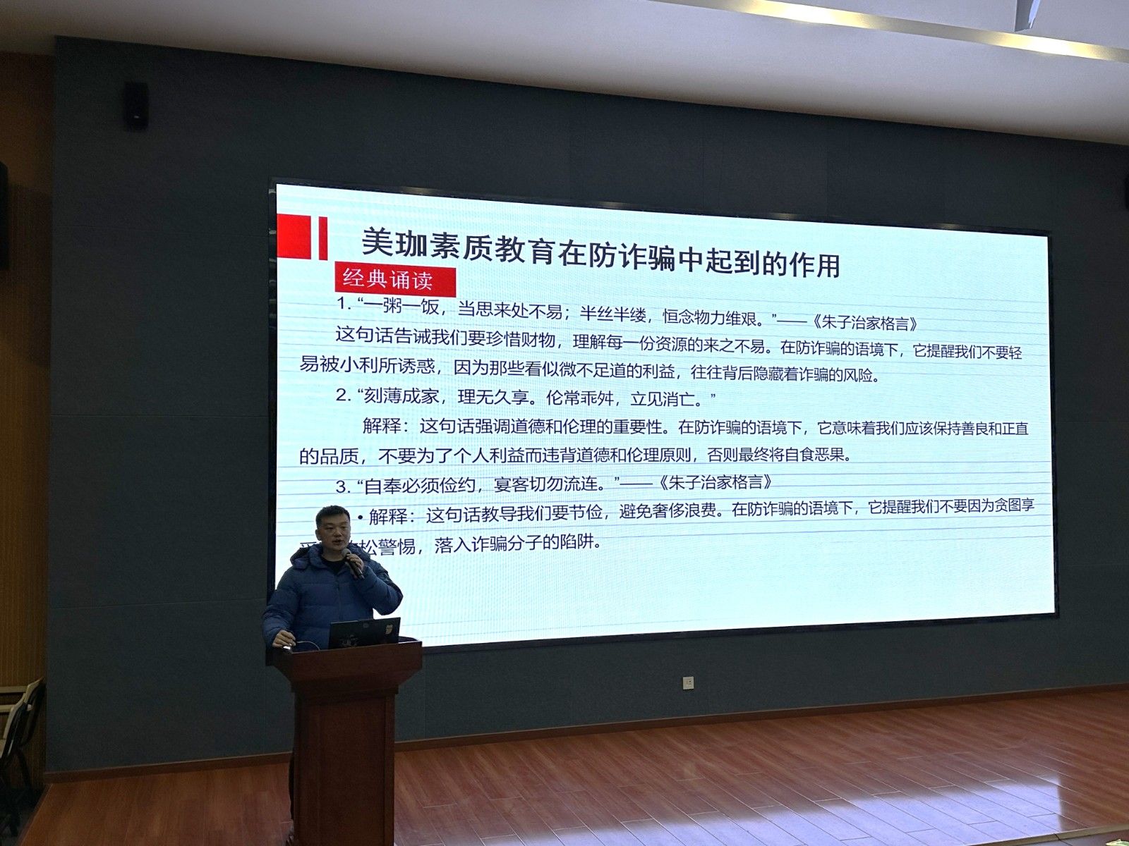 在活动中,刘老师从“大学生易受骗的原因、常见的诈骗手段、案例分析、相关法律法规以及美珈素质教育在防诈骗中起到的作用”几个角度,进行了深入浅出的宣传和讲解。他采用生动易懂的语言,结合具体案例,以案释法,以法论事,详细解读和剖析了一系列真实而生动的诈骗案例。并重点讲述了美珈素质教育在防诈骗中起到的至关重要的作用。同学们在潜移默化中接受了法律教育,深刻了解到学习法律、理解法律、遵守法律、运用法律的重要性,并对美珈素质教育有了更深的认识。