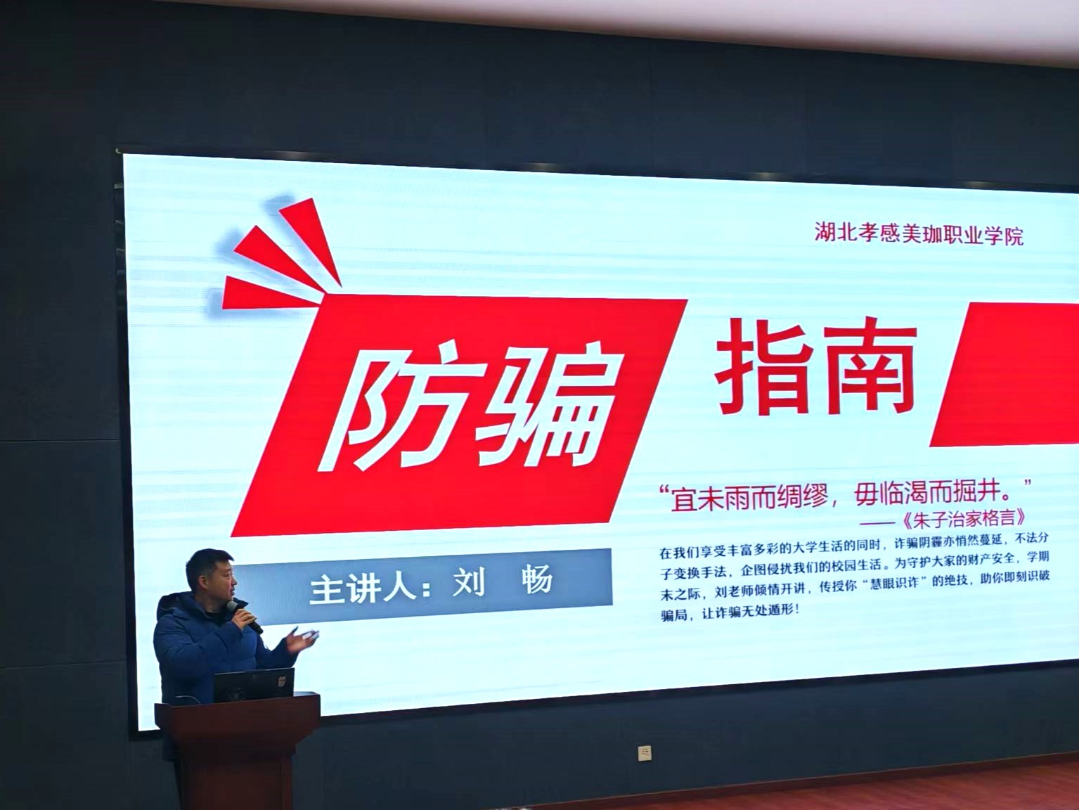 12月12日晚8:30,我校在智能制造楼学术报告厅召开“宜未雨而绸缪,毋临渴而掘井”为主题的防诈骗讲座。讲座由学工处刘畅老师主讲,各学院100多名班长到场聆听了讲座。