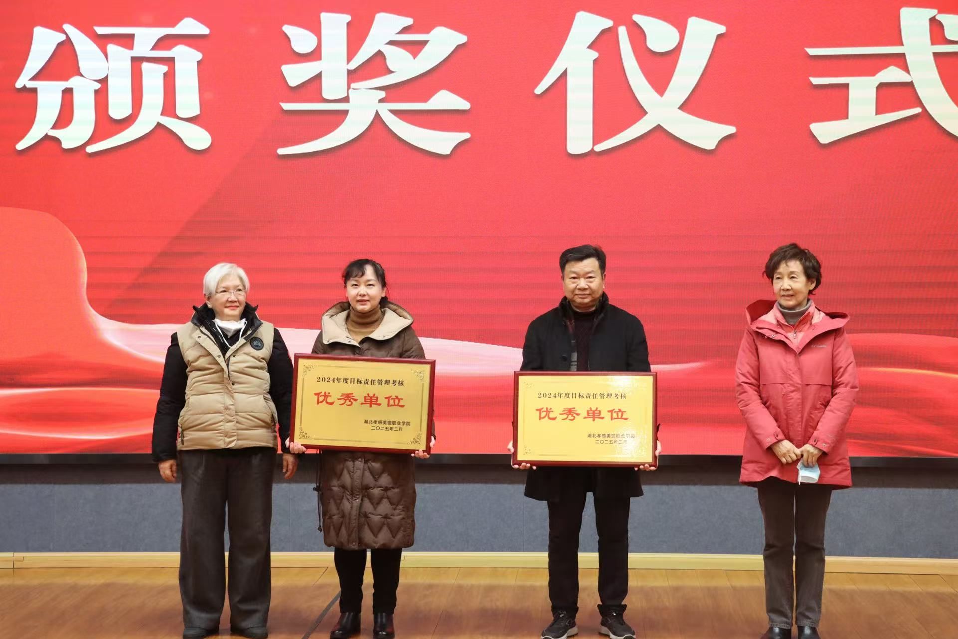 校长陈再平为2024年度考核优秀教职工代表颁发证书。他们是张振寰、杨玉梅、陈虎生、朱葛丹、朱汉敏、杨怡雯、刘超、赵倩、李莎、石天宝、毛波军、毛祥、戴勇。名誉校长萧永瑞、党总支陈书记为2024年度考核优秀部门国际商业学院、人事处颁奖。
