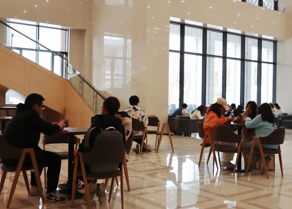 图书馆设施先进、功能齐全,四层挑高穹顶的图书、期刊、资料阅览室和多功能、小空间特约阅览室、音像视听室,可藏80万册图书的书库,电子阅览室,外文图书阅览室,研讨室,自习室,学术报告厅等让学生遨游在知识的海洋里,满足学生不断探索真理的追求。图书馆附设咖啡厅和休息大厅提供学生求知之余的休憩空间。