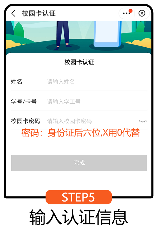 点击”校园卡“认证,输入姓名、学号、校园卡密码(校园卡初始密码为身份证后六位,“X”用“0”代替。)