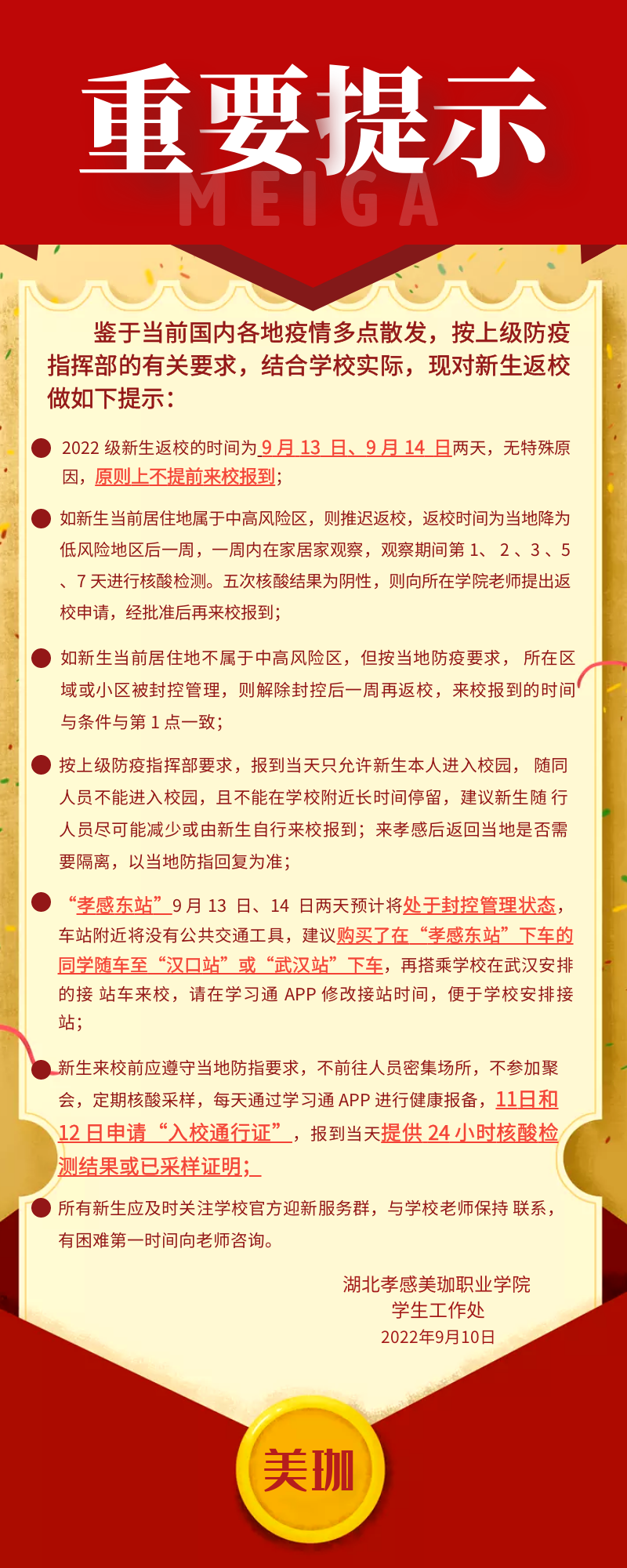 重要提示 | 美珈职业学院关于 2022 级新生来校报到的提示