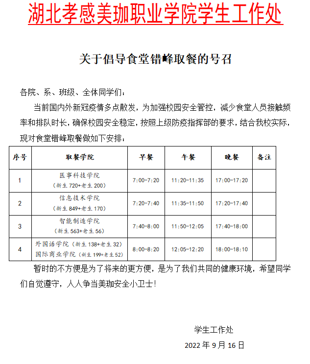 关于倡导食堂错峰取餐的号召