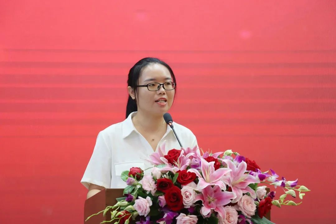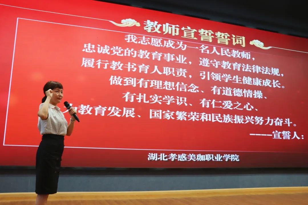 接下来举行全体教师宣誓仪式,医事科技学院专业带头人熊蕊教授带领全体教职工庄严宣誓。国际商业学院方荷老师作为青年教师代表发言。她回顾了入职美珈职院四个月以来,在招生宣传、磨课练课,防疫迎新,教学准备中,锻炼了自己的意志力、心理判断能力、沟通能力。