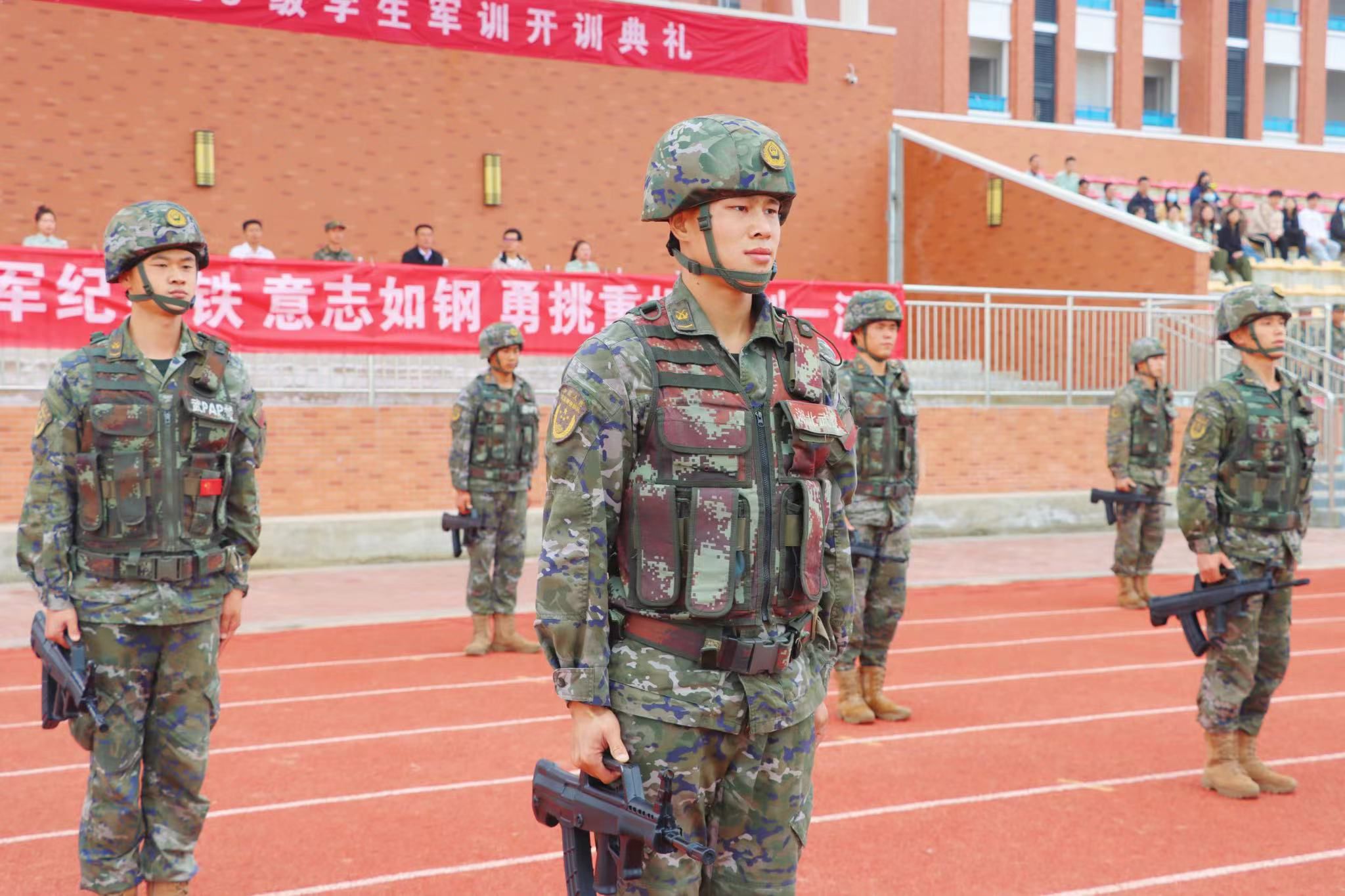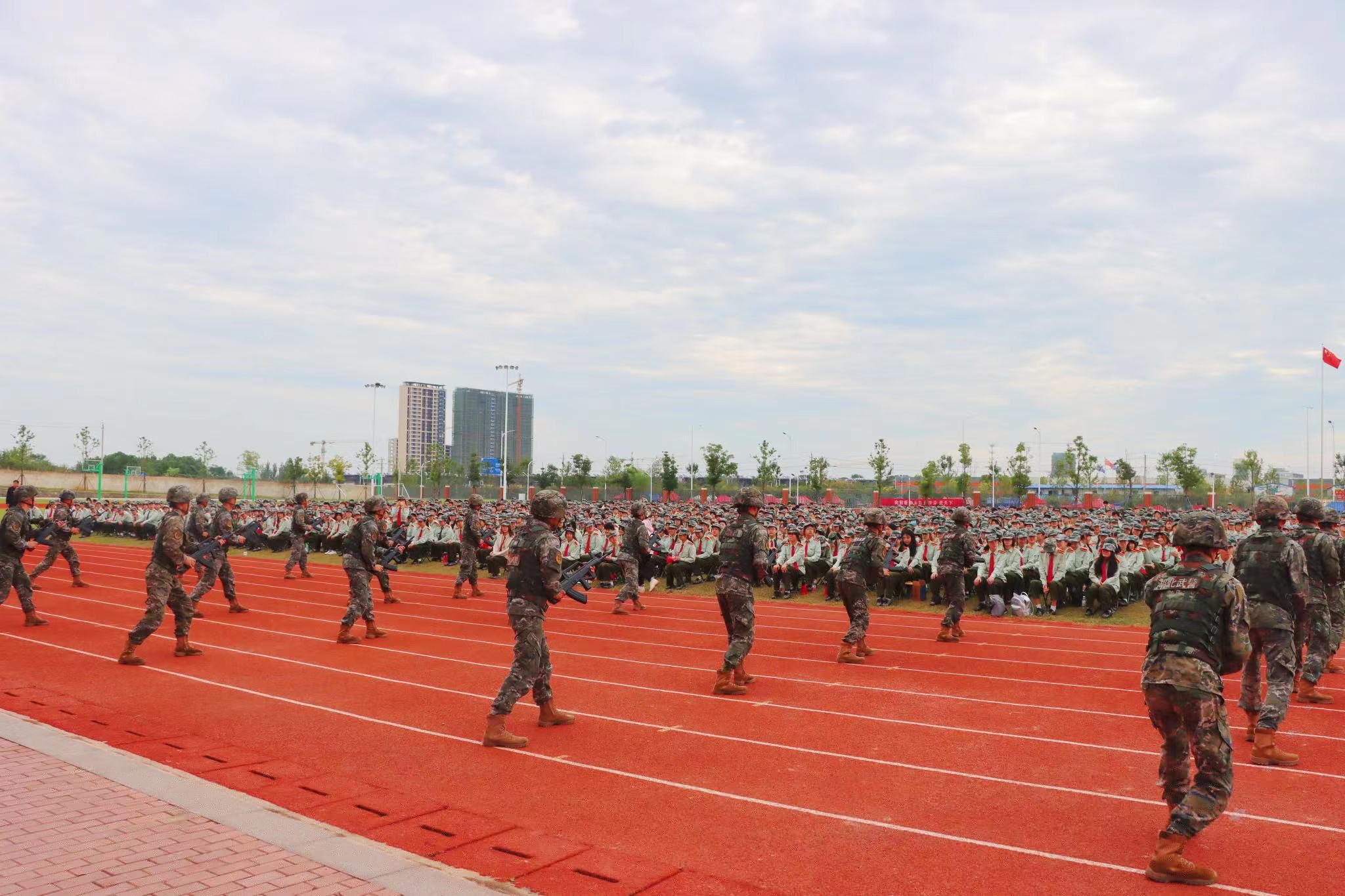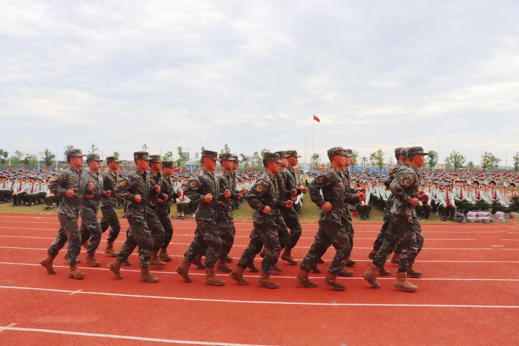 9时10分许,武警孝感支队50名官兵入场,官兵们动作整齐划一,行动中动作变换刚劲有力,敬礼动作潇洒自如,令人肃然起敬。规范、标准的动作表演,赢得在场师生的满堂喝彩,也极大地调动了参训学生参加军训的热情,并对即将到来的14天军训充满期待。
