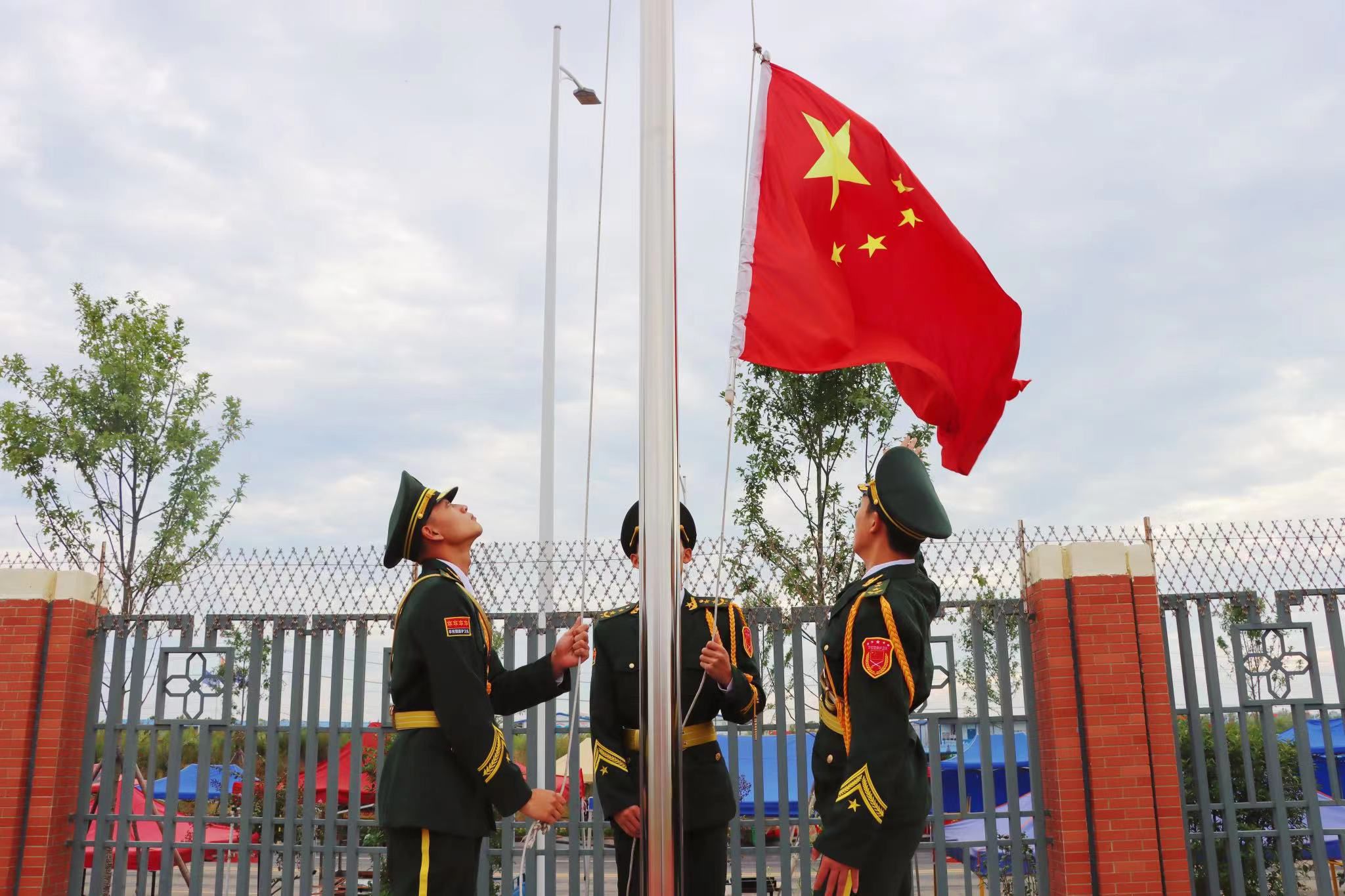 在庄严的国歌声中,五星红旗冉冉升起,全体人员昂首挺胸,神色坚毅,心潮澎湃。