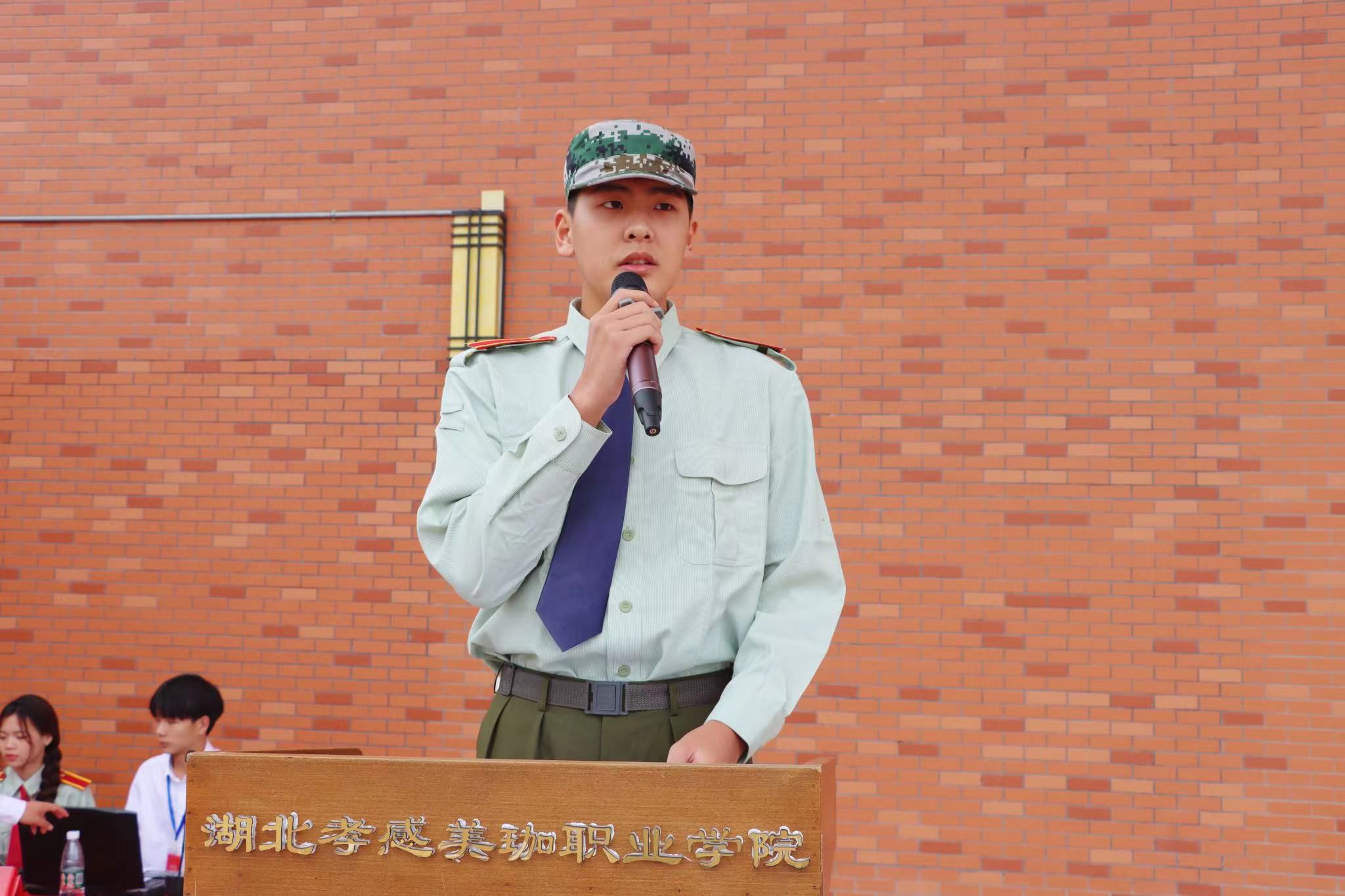 医事科技学院护理2301班的周昊宇同学代表2023级全体军训学员向领导、教官和老师们郑重承诺:我们定会严守纪律,听从指挥;我们会虚心向教官学习,向解放军学习,刻苦训练,力争上游。请领导放心,请教官放心,请老师放心,我们一定能行!