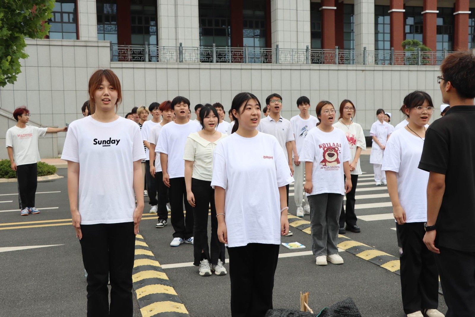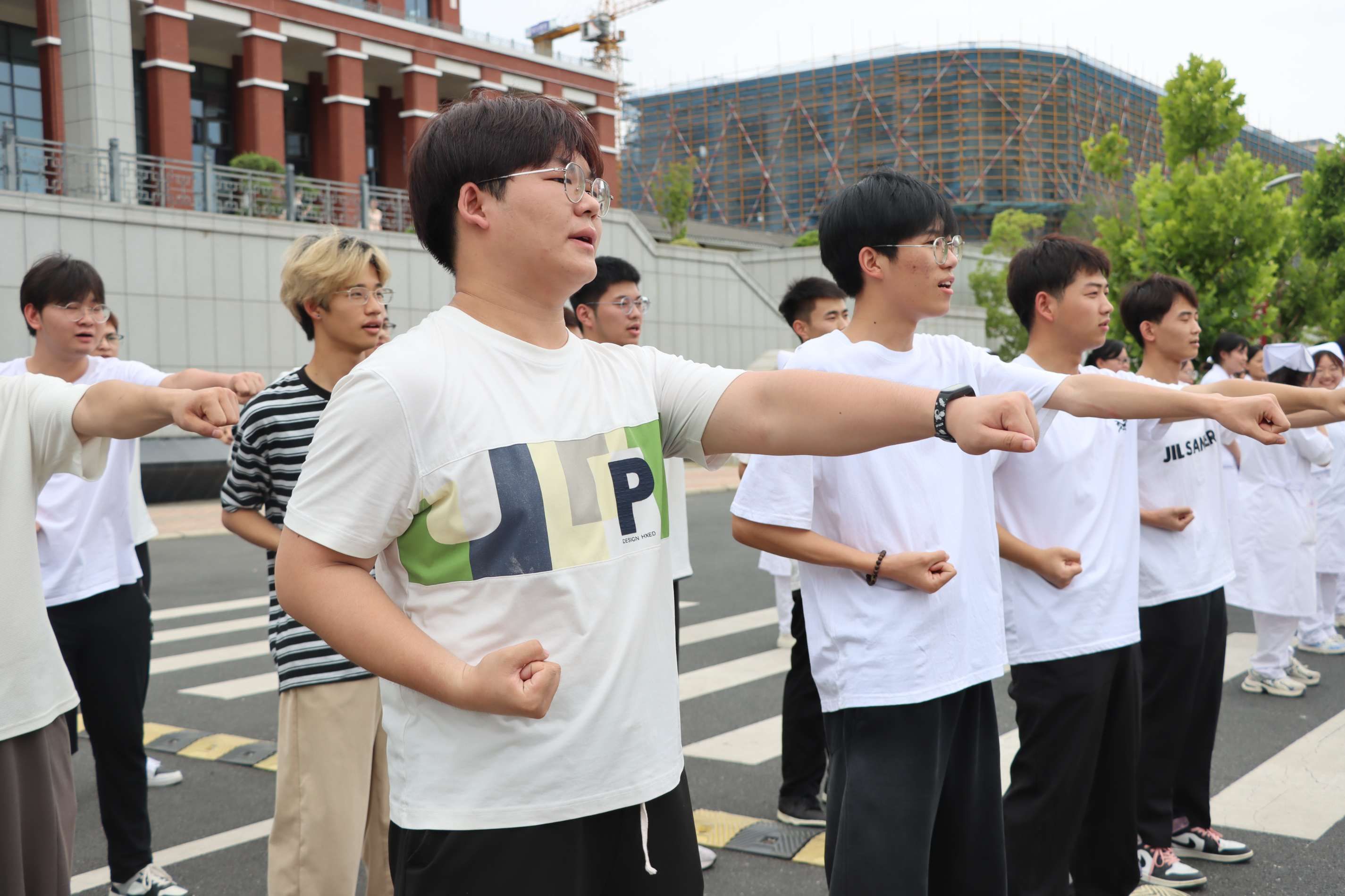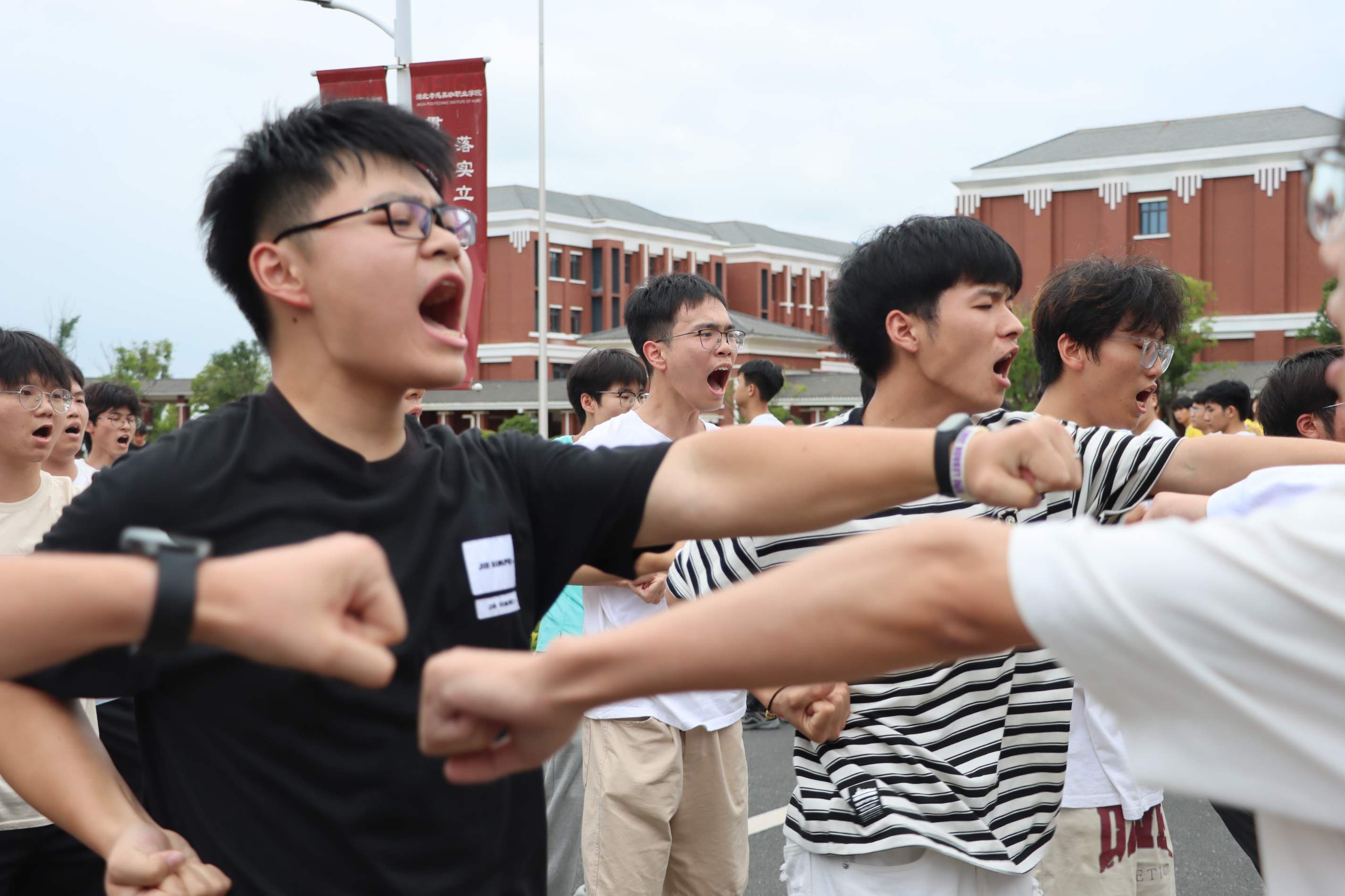 2024年6月19日下午5点,美珈职业学院行政楼前广场上人们热血沸腾。来自不同学院的同学们在这里集聚,他们准备在这个充满激情的“美珈杯”校级冲拳发声PK赛上展示自己的风采。这不仅是力量和技巧的较量,更是青春热血和拼搏精神的展现。