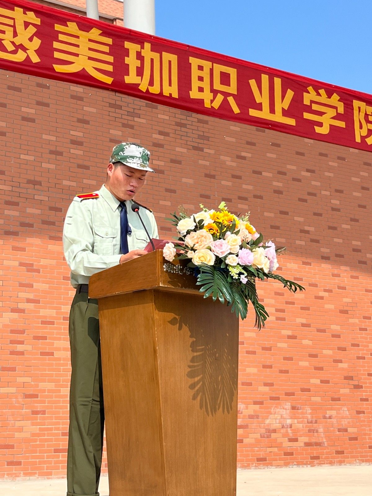 智能制造学院机电一体化技术2404班的王涵代表2024级全体军训学员向领导、教官和老师们郑重承诺:我们一定会严守纪律,听从指挥;我们会虚心向教官学习,刻苦训练,力争上游。用汗水和努力来谱写青春华丽篇章,用实际行动展现美珈职业学院学子的风采!