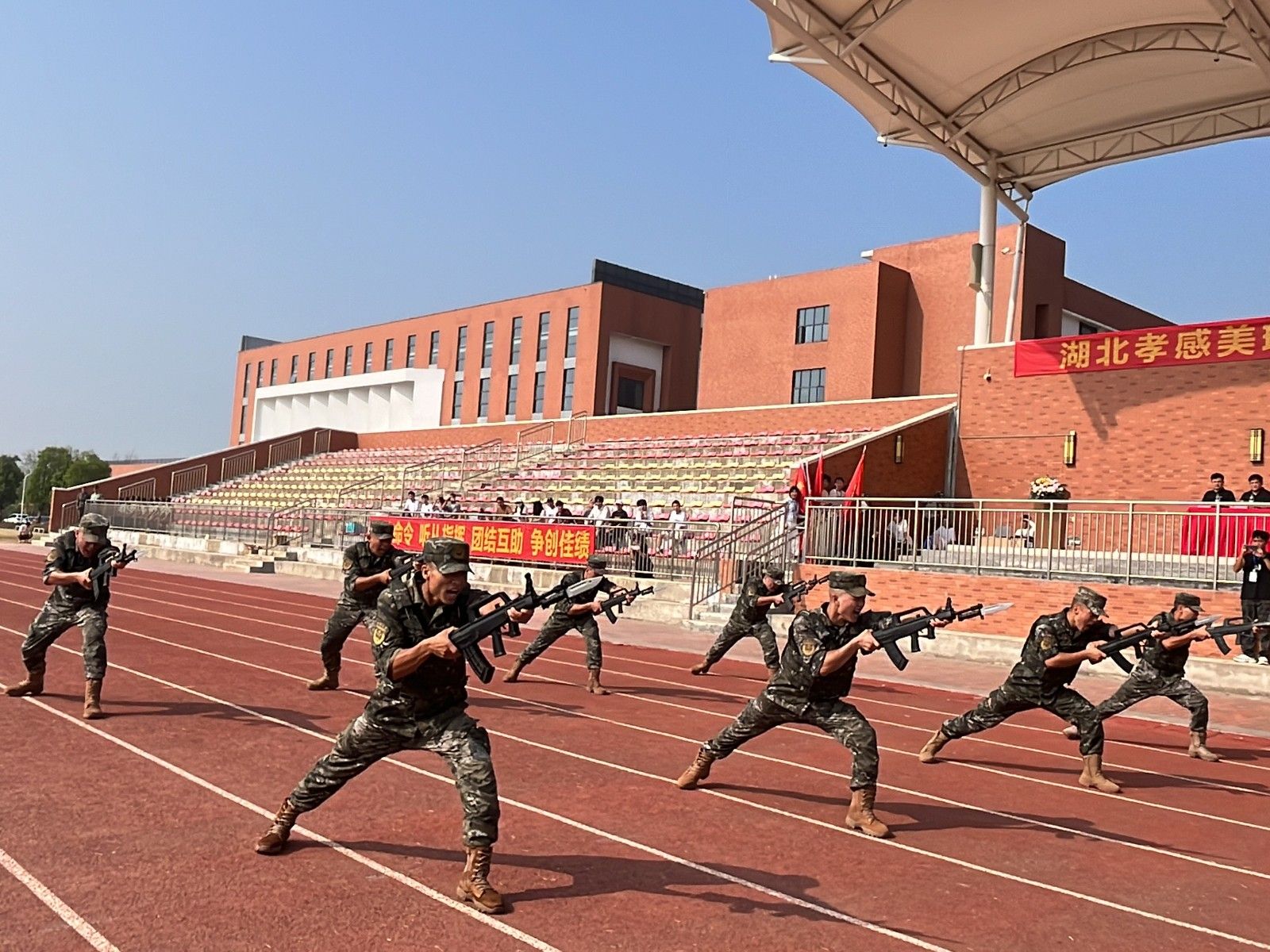 9时10分许,武警孝感支队官兵入场,官兵们动作整齐划一,行动中动作变换刚劲有力,敬礼动作潇洒自如,令人肃然起敬。规范、标准的动作表演,赢得在场师生的满堂喝彩,也极大地调动了参训学生参加军训的热情,并对即将到来的14天军训充满期待。
