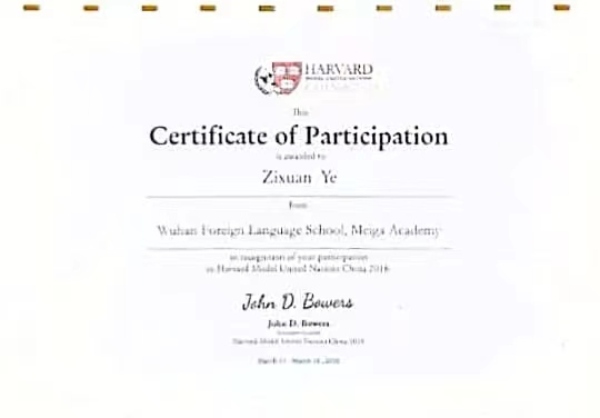 叶紫轩不仅就读美珈职院,而且还是武汉外国语学校美加分校国际高中部2016级毕业生,是美珈素质教育培养出来的一名优秀学子。在美加外校,她参与了许多活动和比赛,并获得不错成绩:哈佛模拟联合国大赛参与奖、北美学术十项全能中国赛优秀奖和“微种子”商业模拟校园挑战赛第二名。