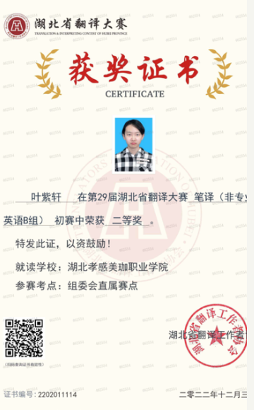 2022年,叶紫轩作为美珈职院学生代表出席孝感市学生联合会第一次代表大会。大一年级,她便一次性通过了初级会计师证书,取得了经济法基础86分、初级会计实务93分的优秀成绩。同年,还获得了第三届全国高等院校财务数据化大赛三等奖、湖北省翻译大赛初赛二等奖。