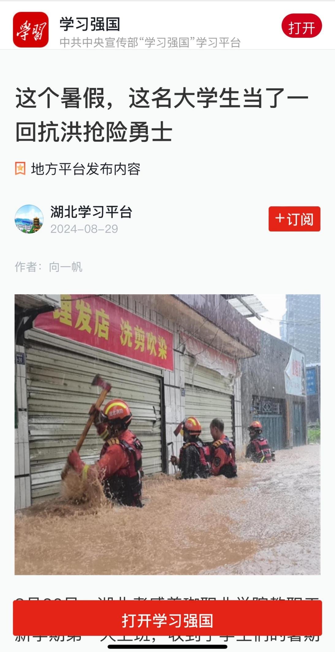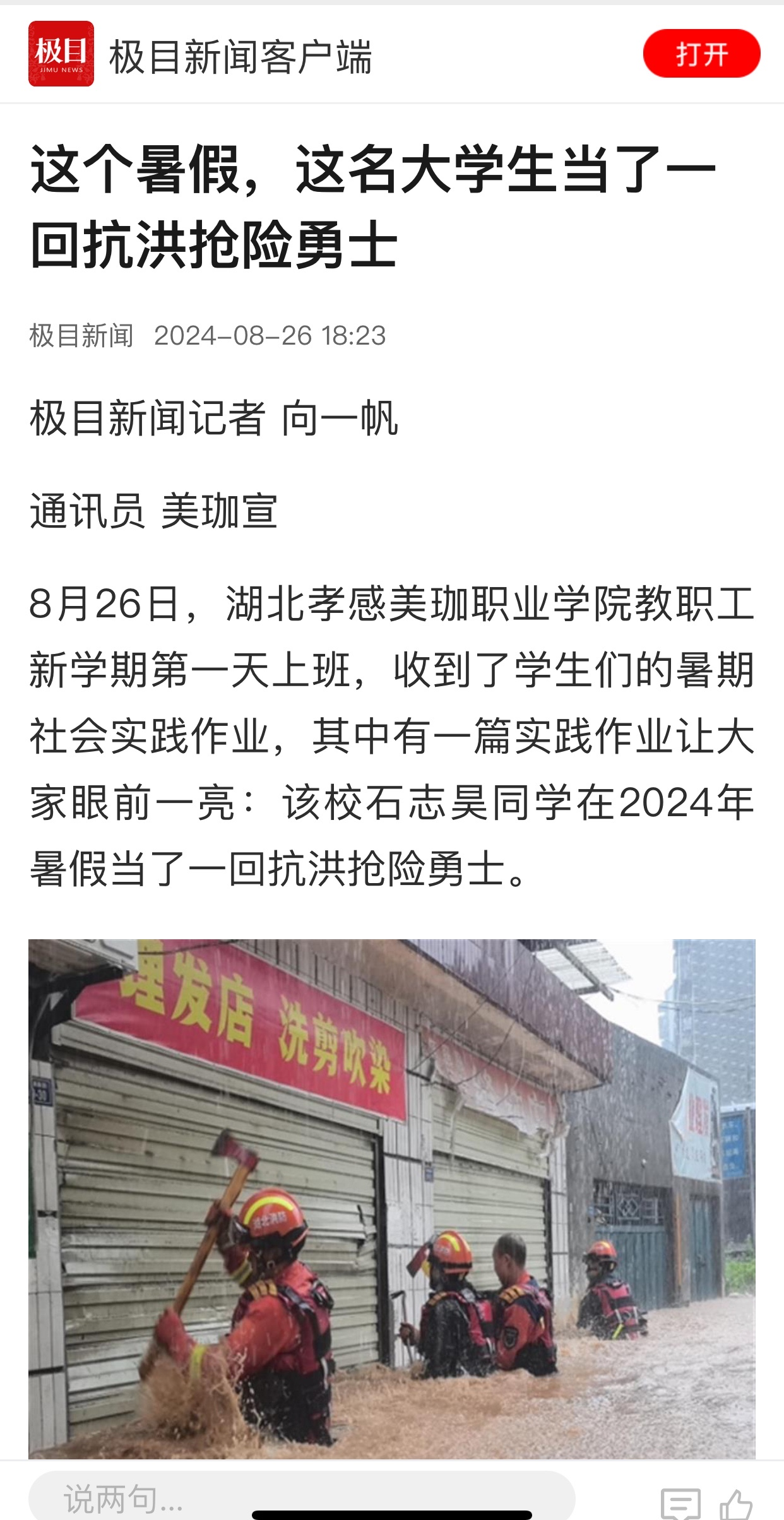 8月26日,新学期上班第一天,“美珈职院”微信公众号推出《2024年暑假,美珈的学生在干啥?》,重点报道了《抗洪抢险中的美珈勇士》,此后,中国网以《湖北一在校大学生暑期积极参与抗洪抢险》为题,中国青年报以《美珈职院学生在湖北丹江口市抗洪抢险一线》为题,学习强国和极目新闻以《这个暑假,这名大学生当了一回抗洪抢险勇士》为题,孝感晚报以《这个暑假,他当了一回抗洪抢险勇士》为题分别进行了报道。