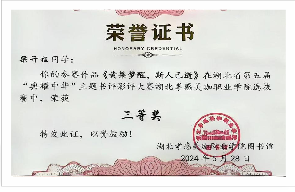 就在这时,李明老师给予了他们不断的指导和鼓励,让他们学会了迎难而上,不再畏惧挑战。4月份,梁开程和他的团队带着初步掌握的技能前往武汉工程大学(流芳校区),参加了湖北省的省赛。在激烈的竞争中,他们凭借团队的默契和实力,荣获湖北省二等奖。这份荣誉不仅是对他们努力的认可,更是激励他们继续前行的动力。