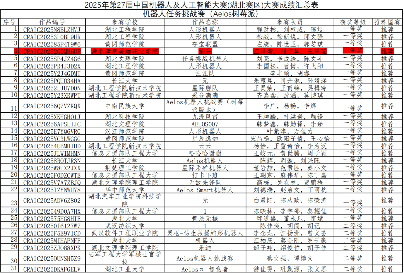 近日,备受瞩目的第二十七届中国机器人及人工智能大赛省赛圆满落幕,美珈职院智能制造学院学子与华中科技大学、华中师范大学、武汉理工大学、中国地质大学、中南民族大学、信息支援部队工程大学、陆军工程大学等一众985、211大学同台竞技。一举斩获省级一等奖1项(省赛第四名)、二等奖2项、三等奖1项!顺利赢得全国总决赛的珍贵入场券!