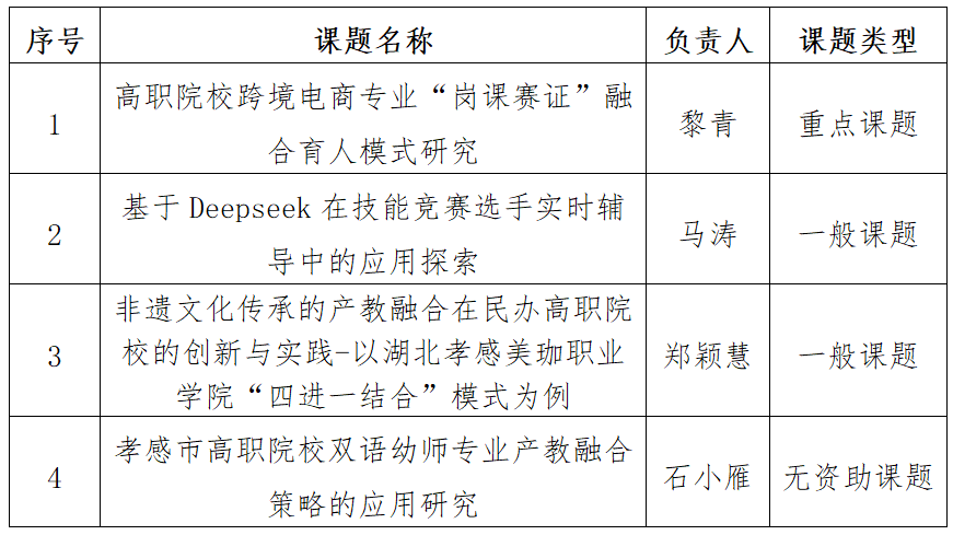 6月19日,孝感市职业教育发展研究中心公布了2025年度孝感市职业教育科研课题立项名单,我校黎青、马涛、郑颖慧、石小雁4位老师的项目成功获批。