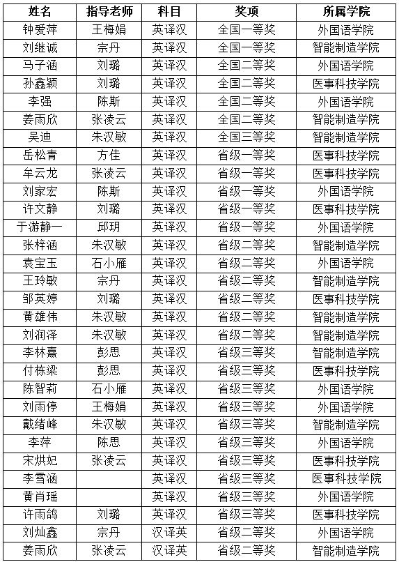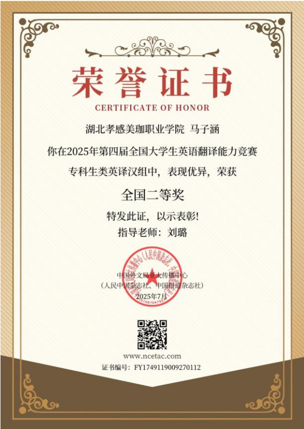 本次第二场竞赛吸引了北京大学、上海外国语大学、中南大学、中国人民大学等786 所高校的学子参与,共收到 3296 份译文。经过评审组与赛点老师的初审、复审及终审,英译汉组与汉译英组最终评选出全国一等奖 71 名、二等奖 173 名、三等奖 267 名,省级一等奖 344 名、二等奖 500 名、三等奖 680 名。在如此高规格、大规模的赛事中,美珈职院学子能脱颖而出,充分展现了强劲的实力。