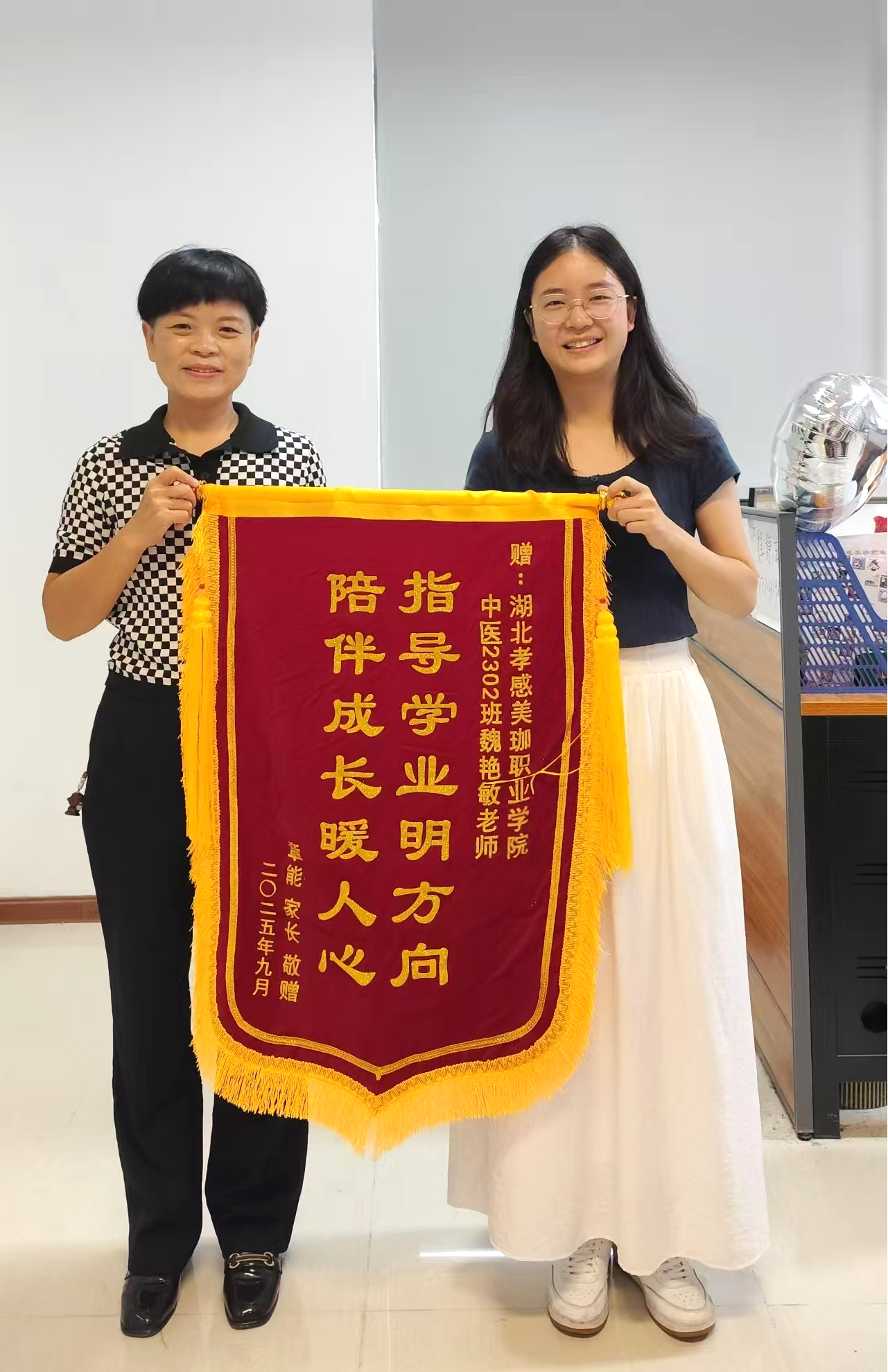 金秋九月,师恩如海。教师节的温馨气氛尚未远去,医事科技学院又收获了一份沉甸甸、暖融融的认可。近日,医事科技学院中医康复技术专业辅导员魏艳敏老师收到了一份特殊的礼物——中医2302班章能同学的家长专程送来一面绣有"指导学业明方向,陪伴成长暖人心"的锦旗,以此表达对学校和老师的诚挚谢意。