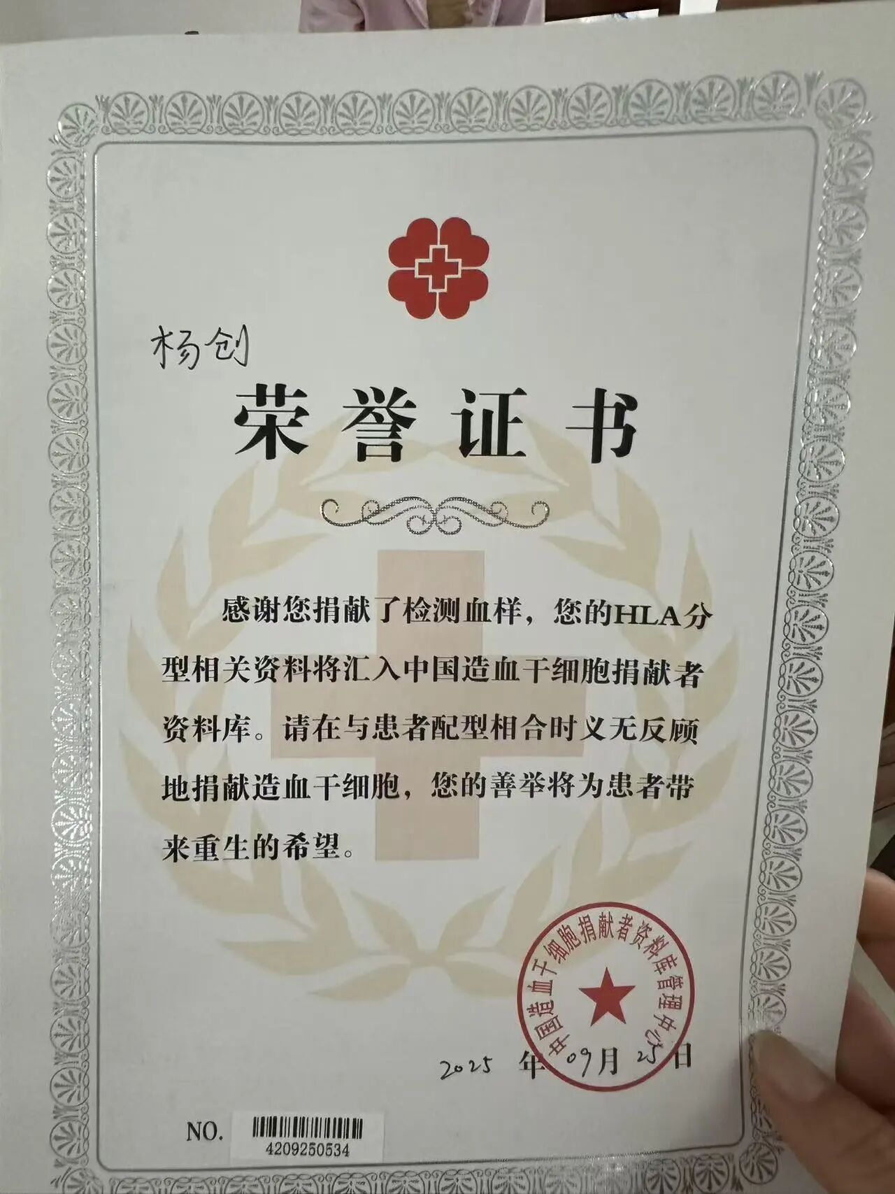 图为杨创正在献血。